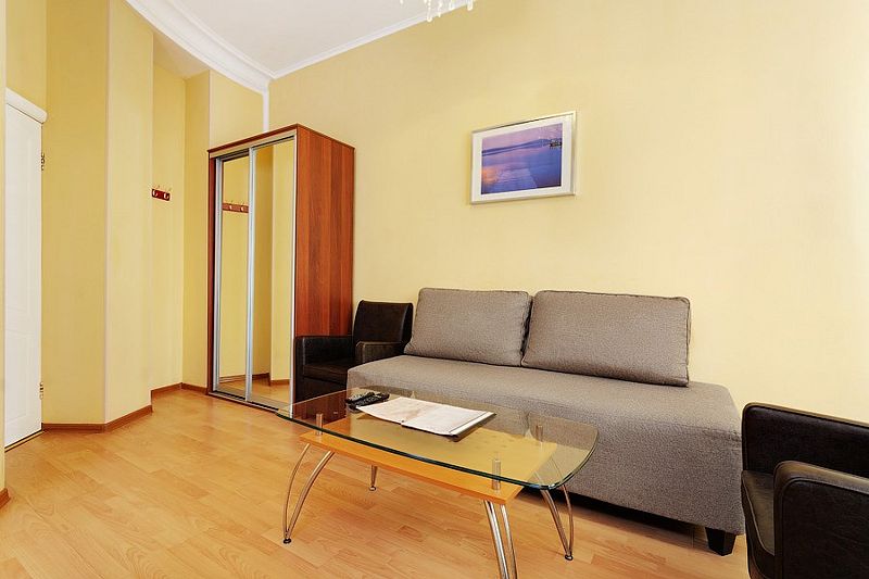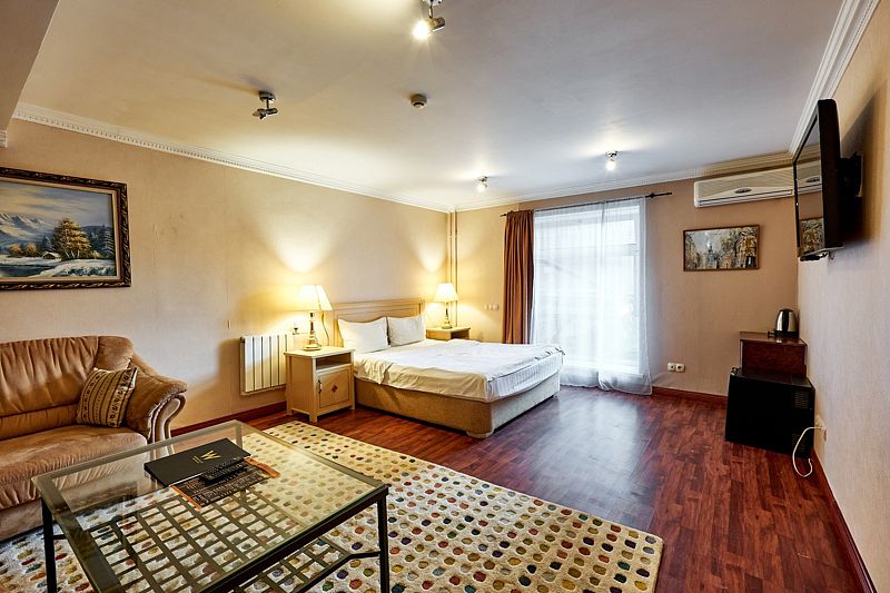 Просторный двухместный номер категории «Студио» — оптимальный вариант для романтического отдыха вдвоем или деловой поездки и встреч с партнерами. Интерьер номера тщательно продуман — теплые оттенки, в которых он выдержан, расслабляют, а изысканная мебель из ценных пород дерева и натуральной кожи придает номеру солидность. Широкая двухместная кровать размера «King size» с ортопедическим матрацем гарантирует сладкий сон.