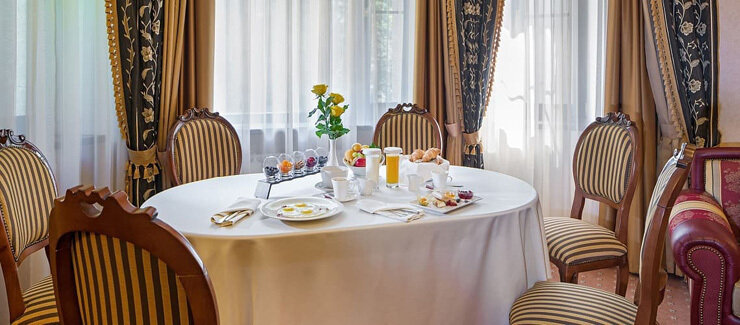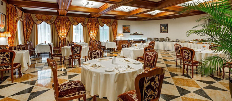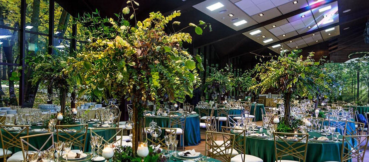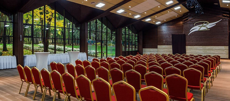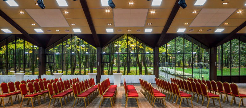 Торжественный, просторный и многофункциональный зал с большими витражами и великолепным видом на живописную территорию отеля. Идеальное решение для проведения мероприятий любого уровня и формата.