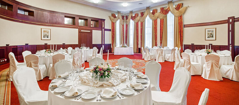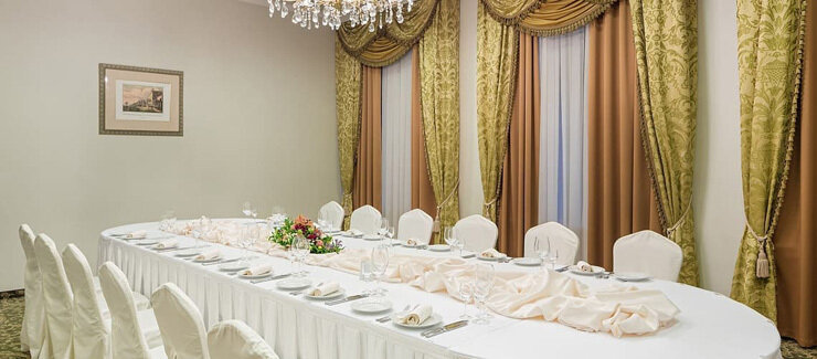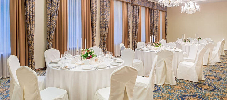Элегантный, светлый, универсальный зал с видом на парковую зону отеля. Идеальное решение для проведения мероприятий делового формата, официальных церемоний, семейных торжеств.