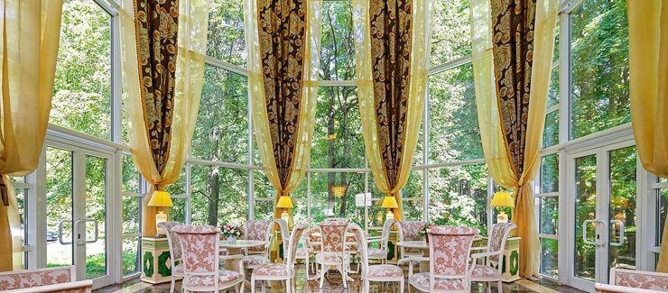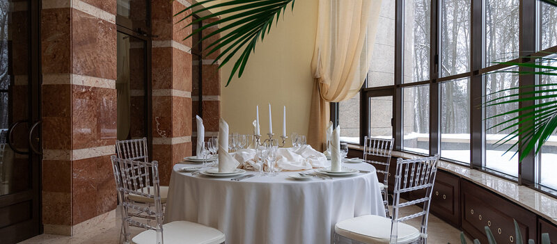 Элегантная, роскошная закрытая «Терраса» с эркерными витражами и панорамным видом на окружающую здание природную парковую зону заказника «Долина реки Сетунь». Умиротворенная изысканная атмосфера в любое время года. Идеальное решение для проведения небольших мероприятий, требующих особенной атмосферы и уюта.