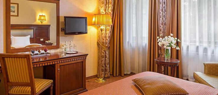 март 2019 г.Одноместный стандартВсе так по-советски) в лучшем смысле этого слова: тяжелая партийная мебель, узорчатые тяжелые парчовые гардины... прямо ух! Отличная кровать! В номере очень тепло, что позволяет открыть окна для проветривания. В этом смысле комфортно. Хороший телевизор, система кронштейнов позволяет удобно смотреть лёжа, хотя он прилеплен над самой кроватью.
