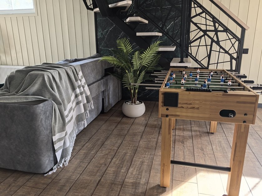 Фруктовая сезонная тарелка и конфеты к чаю в подарок. Для развлечения есть настольные игры, дартс, игровой футбольный стол. Просторная терраса, мангал, шампура, парковочные места, детский стульчик для кормления также входят в стоимость проживания.