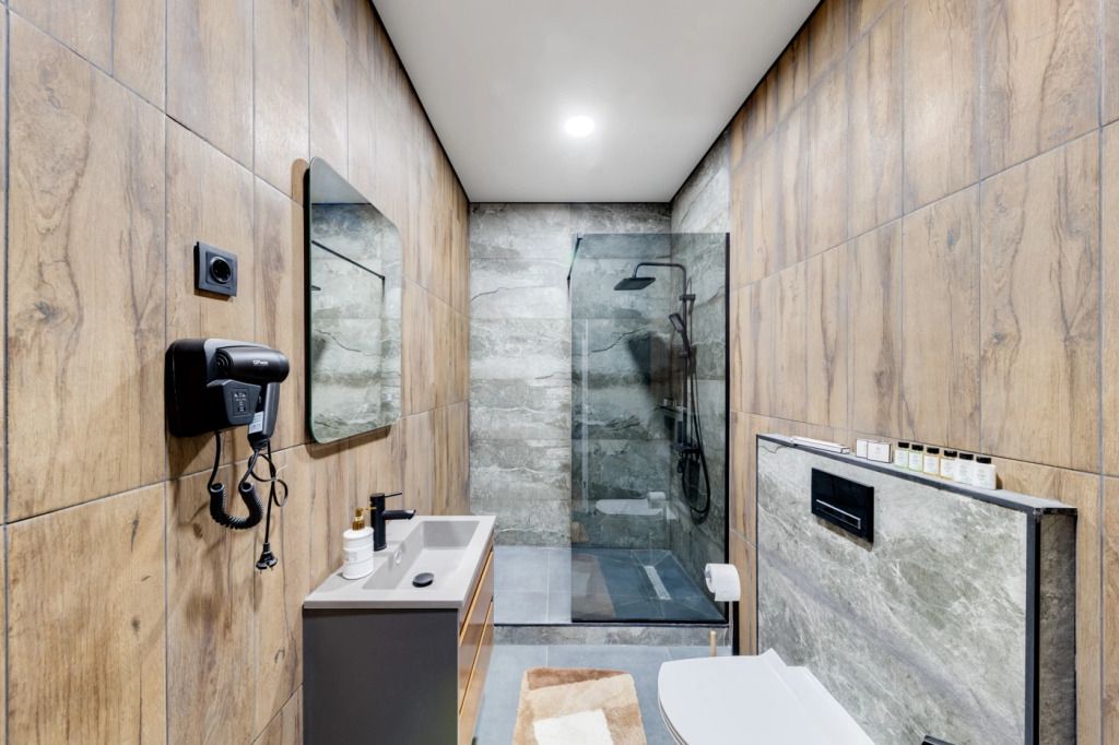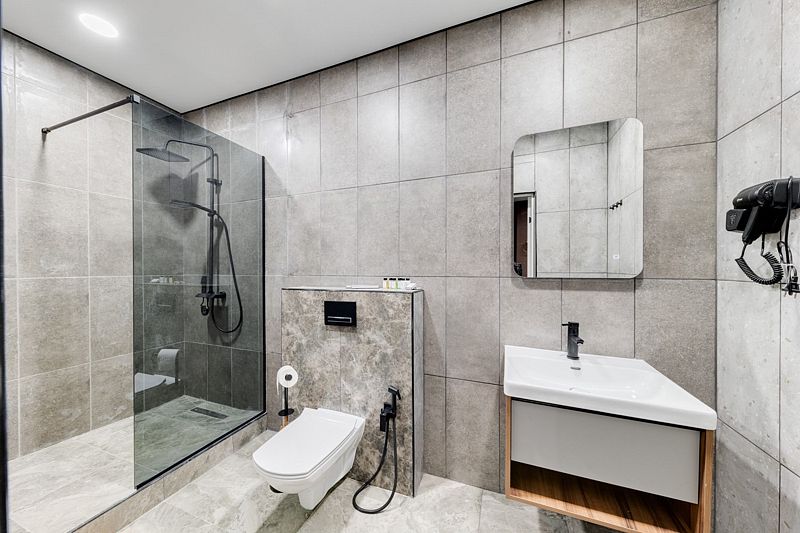 Номер оснащен всеми необходимыми удобствами, такими как мини-холодильник для хранения прохладительных напитков, кондиционер, обеспечивающий комфортную температуру в любое время года, и фен для вашего удобства. Мы также предоставляем мягкие тапочки и уютные халаты, чтобы вы чувствовали себя как дома.