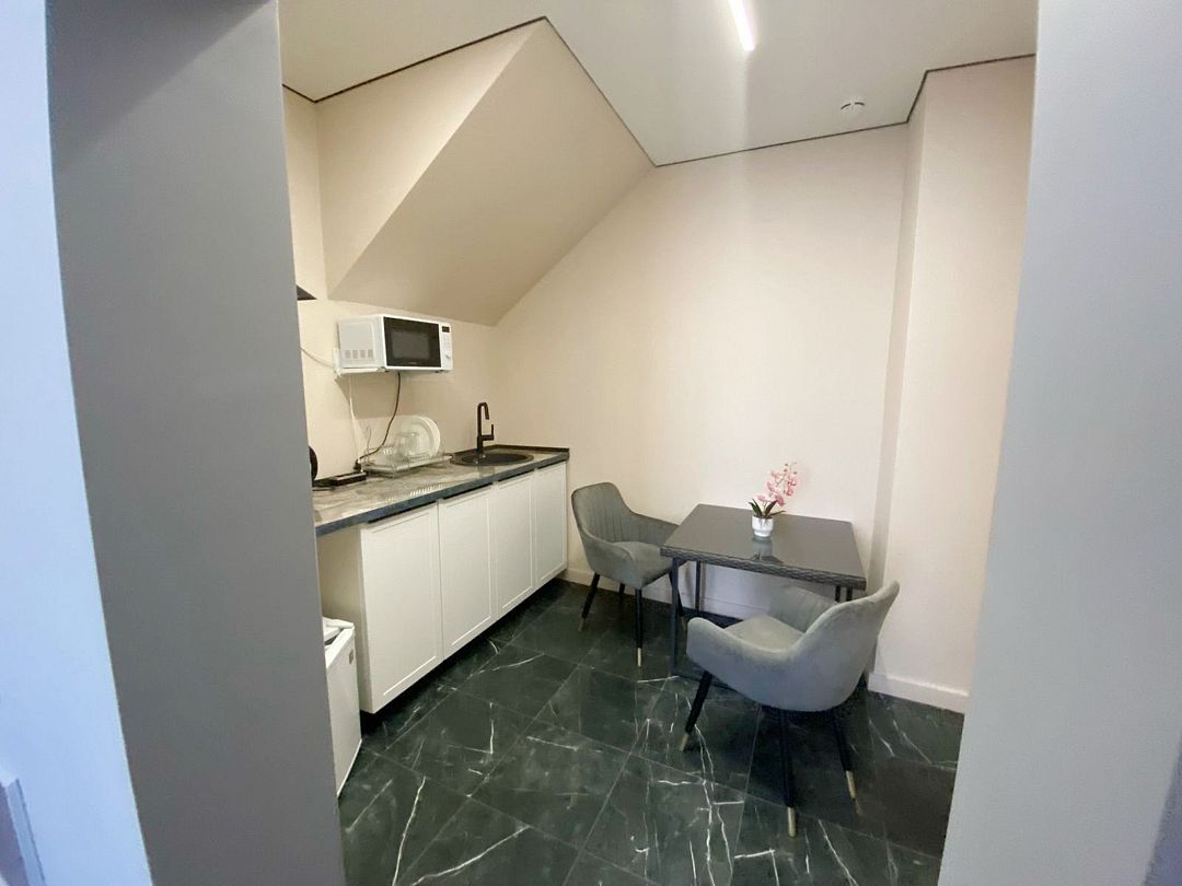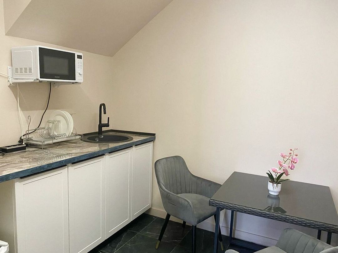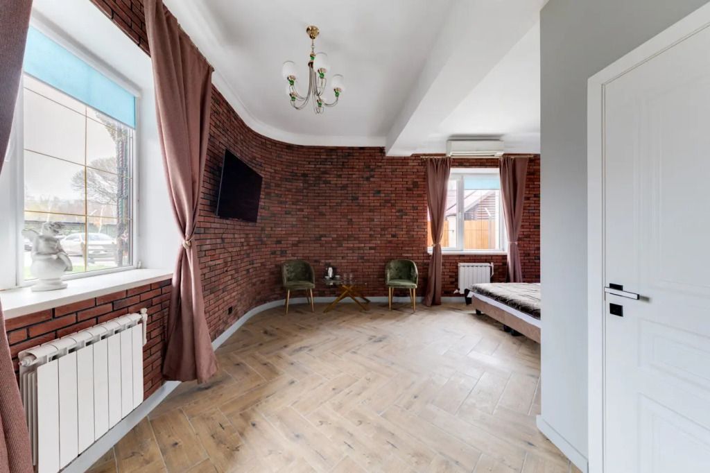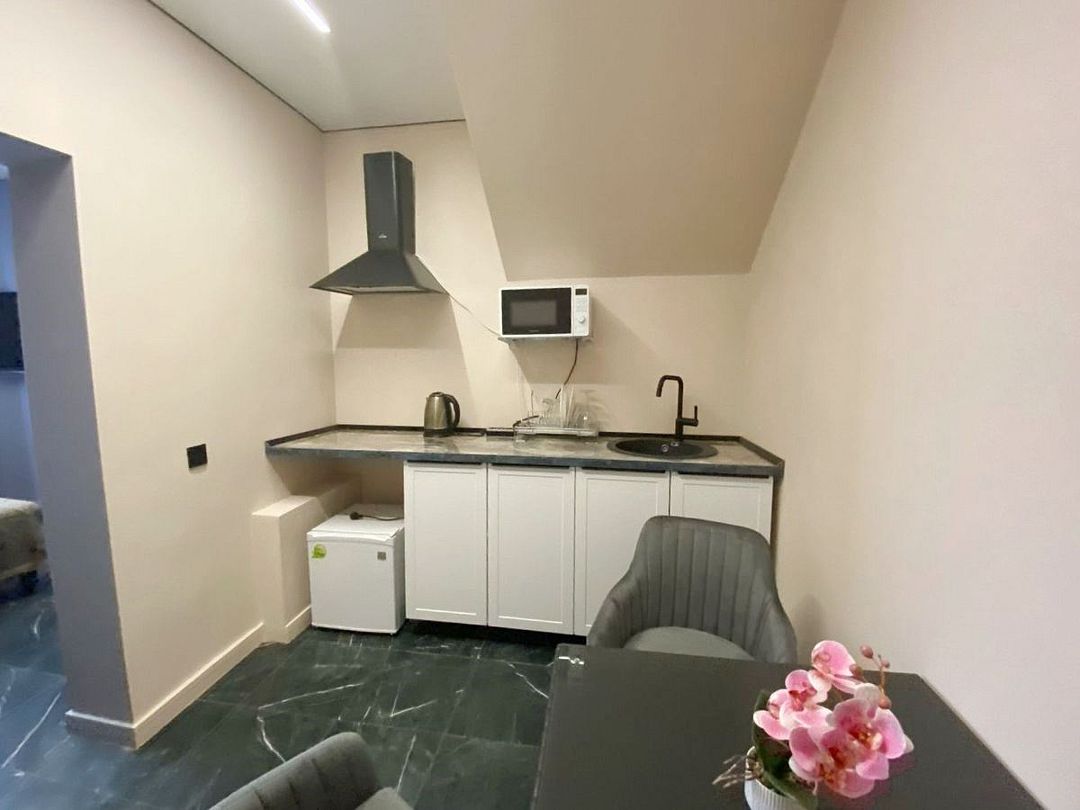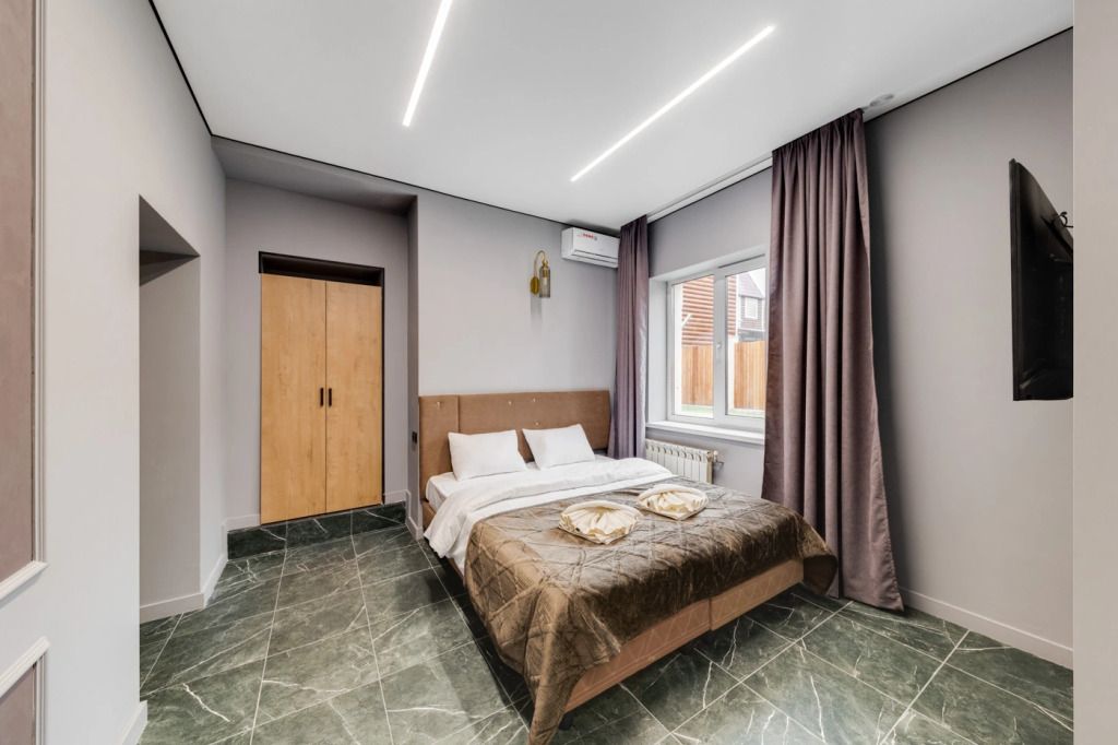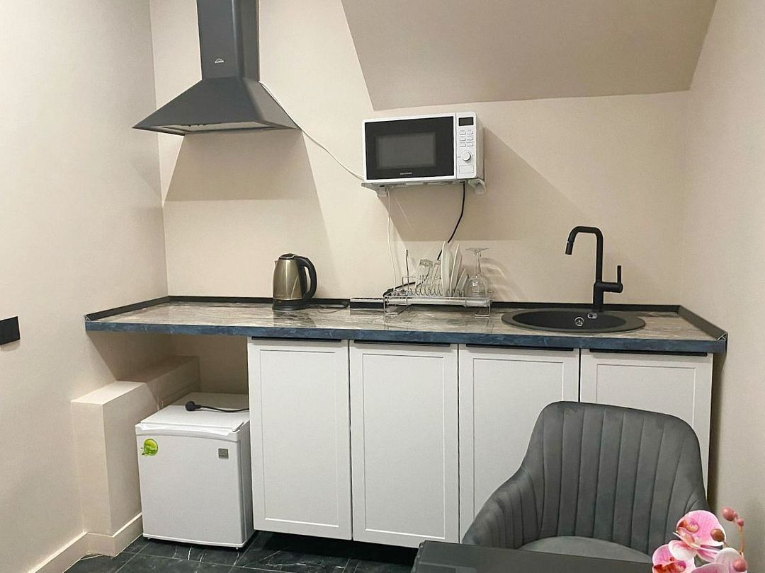 Добро пожаловать в наш уютный Апартамент с кухней на первом этаже с отдельным входом. В этом номере гостям предлагается идеальное сочетание комфорта и уюта. Вас ждет удобная двуспальная кровать с мягким постельным бельем, обеспечивающая спокойный и приятный сон. Отдельный санузел с душевой кабиной и туалетом, фен, косметические средства и мягкие полотенца создадут все условия для вашего ухода за собой. Для вашего удобства номер оснащен отдельной мини-кухней с кухонным уголком, мини-холодильником, электрочайником, раковиной, посудой и СВЧ. Чайный набор и бокалы для вина всегда в вашем распоряжении. Также в номере предоставляются мягкие тапочки, халаты, кондиционер, телевизор для вашего развлечения и бесплатный Wi-Fi, чтобы вы всегда были на связи. Эти стильные комфортные апартаменты созданы для того, чтобы вы чувствовали себя как дома, наслаждаясь всеми удобствами и уютом.