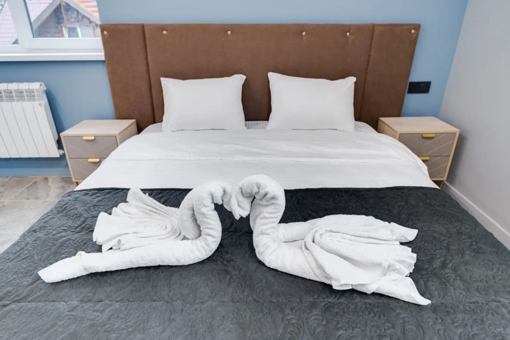 В этом номере вас ждет большая двуспальная кровать с мягким постельным бельем высочайшего качества, которая подарит вам незабываемый отдых и сладкий сон.