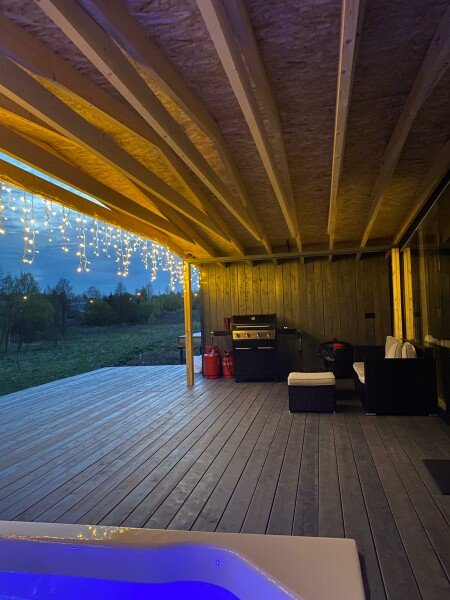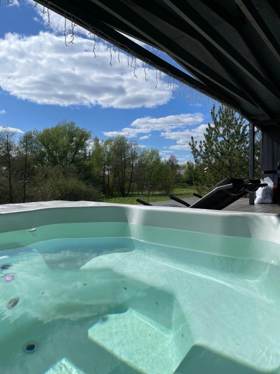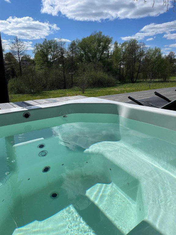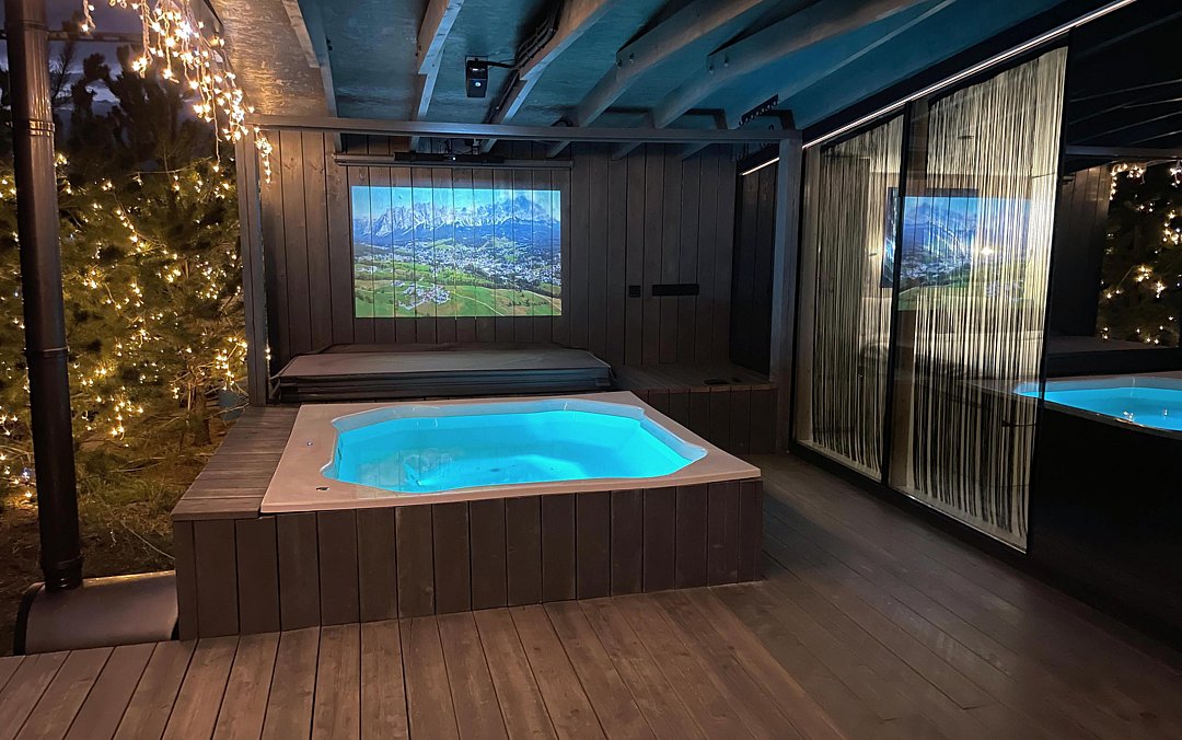 Гостей ждет уютное джакузи с горячей водой прямо на веранде — идеальное место, чтобы насладиться отдыхом на свежем воздухе. А для создания особой атмосферы предлагается просмотр любимых фильмов прямо в джакузи!