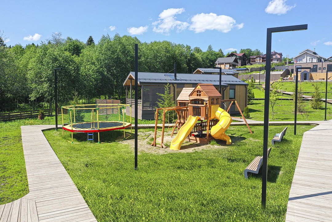К вашим услугам беседка с панорамными окнами, зона для барбекю, а также баня с купелью, где можно расслабиться после насыщенного дня. Дополнительные удобства: безлимитный интернет и детская площадка.