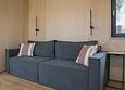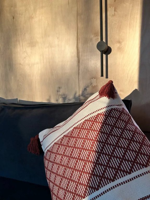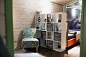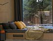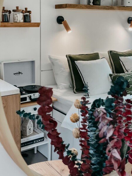 Зона отдыха оформлена с комфортом: ортопедический матрас и подушки Askona, теплое одеяло, мягкие подушки и вязаный плед — создают атмосферу уюта, журнальный столик у напольной кровати позволяет разместить рядом со спальным местом все необходимое, а умная колонка Алиса — добавляет особенное настроение вашему уикенду. Достаточно сказать ей: «Алиса, включи..!»
