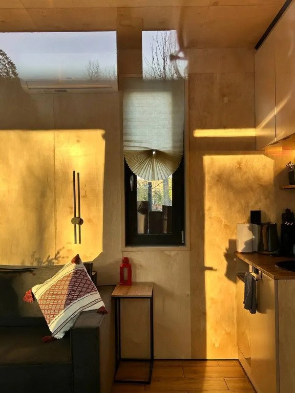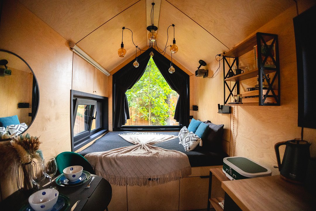 Светлый и уютный дом-студия с панорамным окном, мягкой двуспальной кроватью, ванной комнатой и мини-кухней.