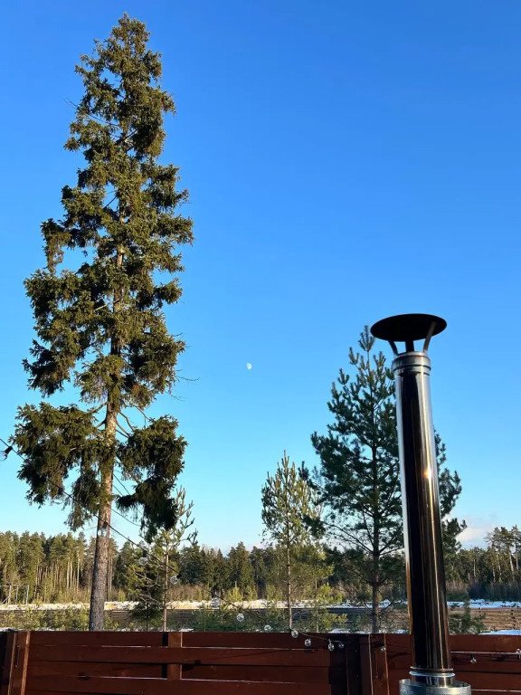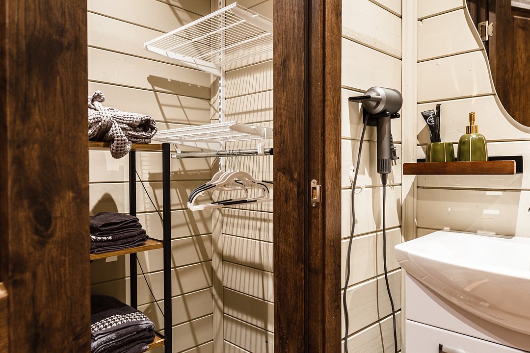 Терраса дома обустроена уличной мебелью, у дома есть купель, зона барбекю, очаг для согревающих вечеров и стол для душевных посиделок за обедом или ужином. Выходить на улицу и гулять вам будет очень удобно в тапочках-кроксах, которые мы предоставляем каждому гостю.