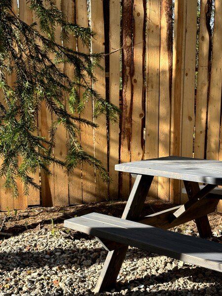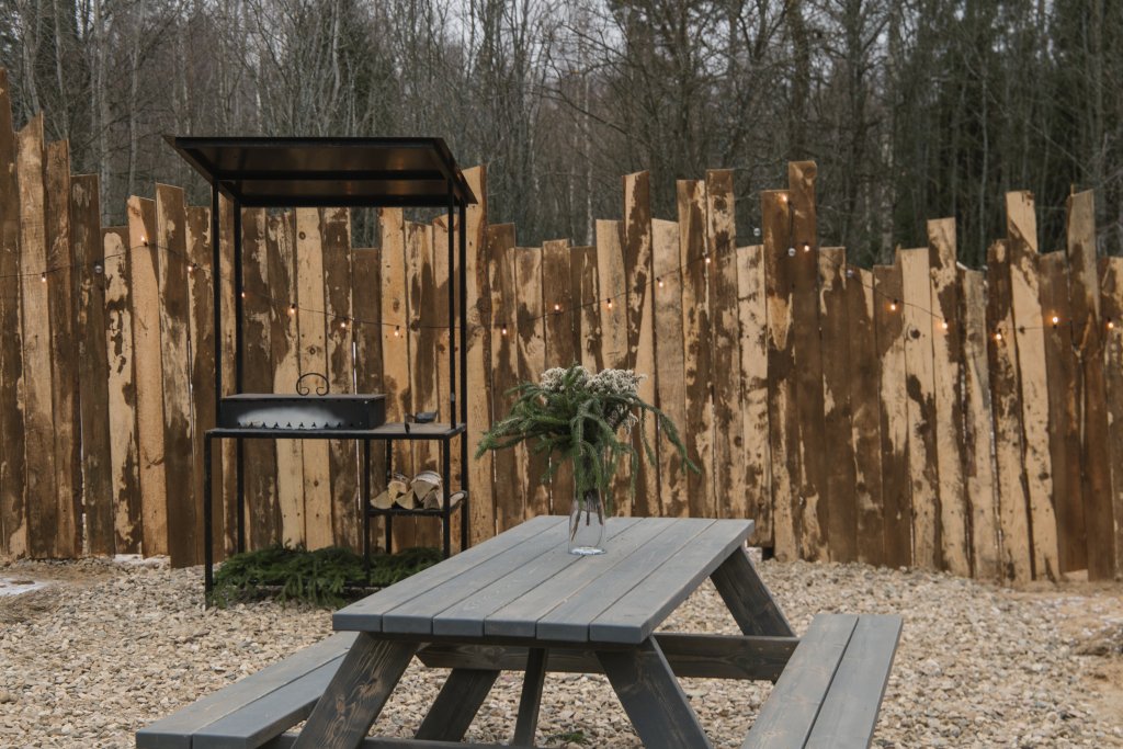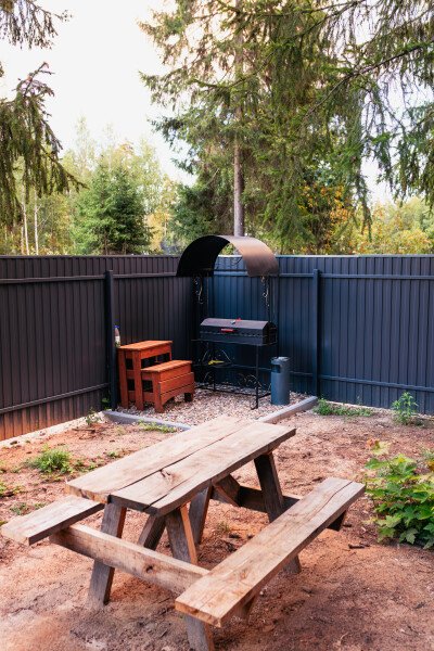 На улице вы сможете насладиться временем на свежем воздухе: уютные лавки и стол, костровая зона и крытый мангал, а также теплые платки для комфортного отдыха в холодное время.