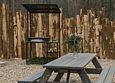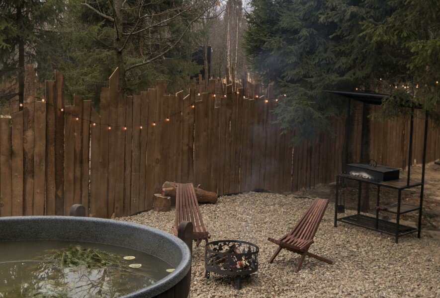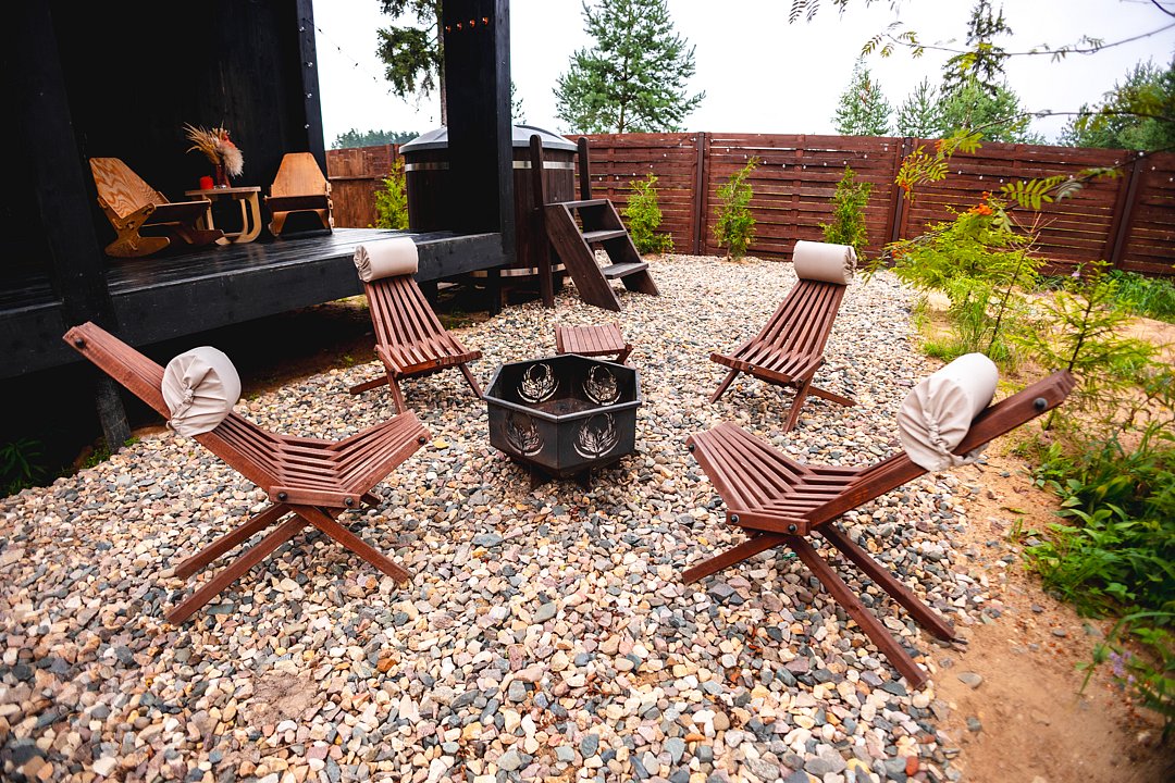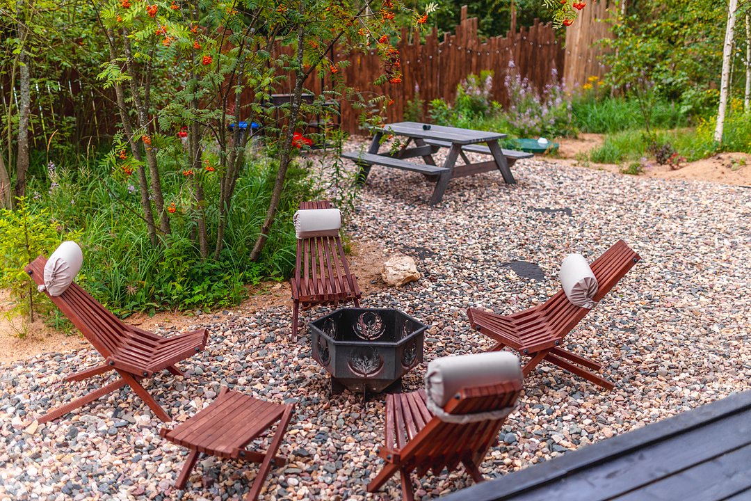 Терраса дома обустроена уличной мебелью, у дома есть купель Фурако, костровая и барбекю зоны.