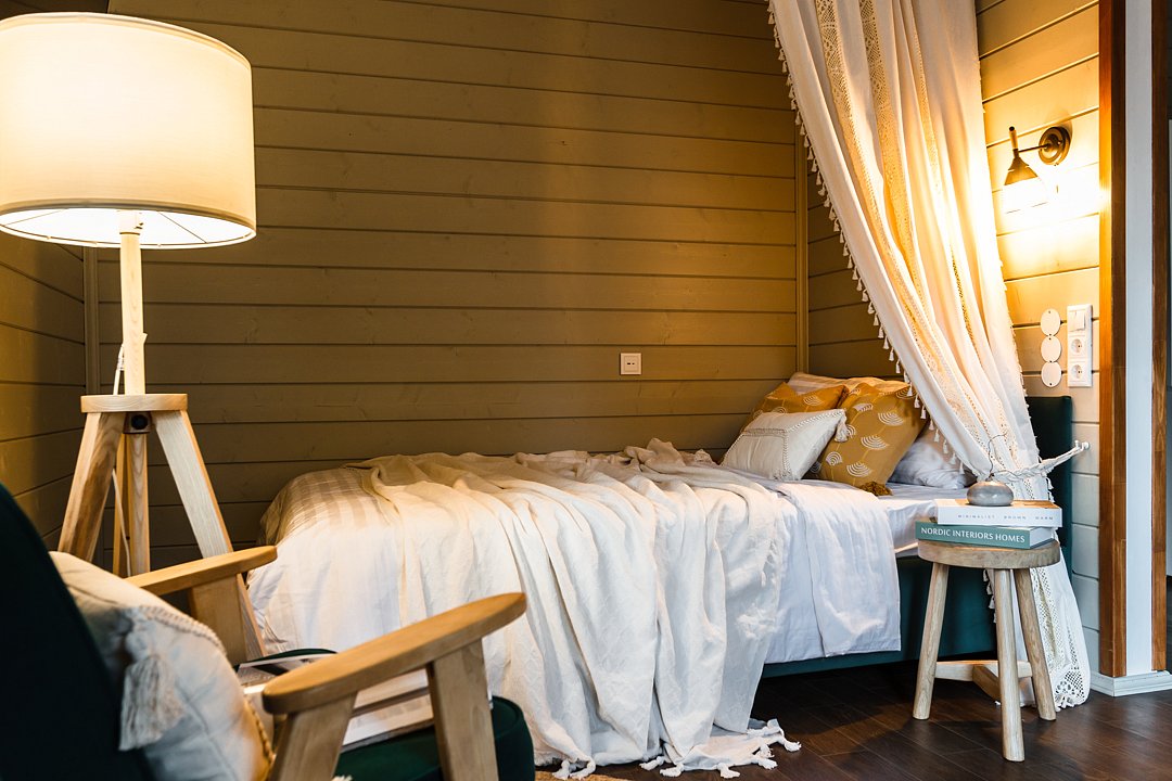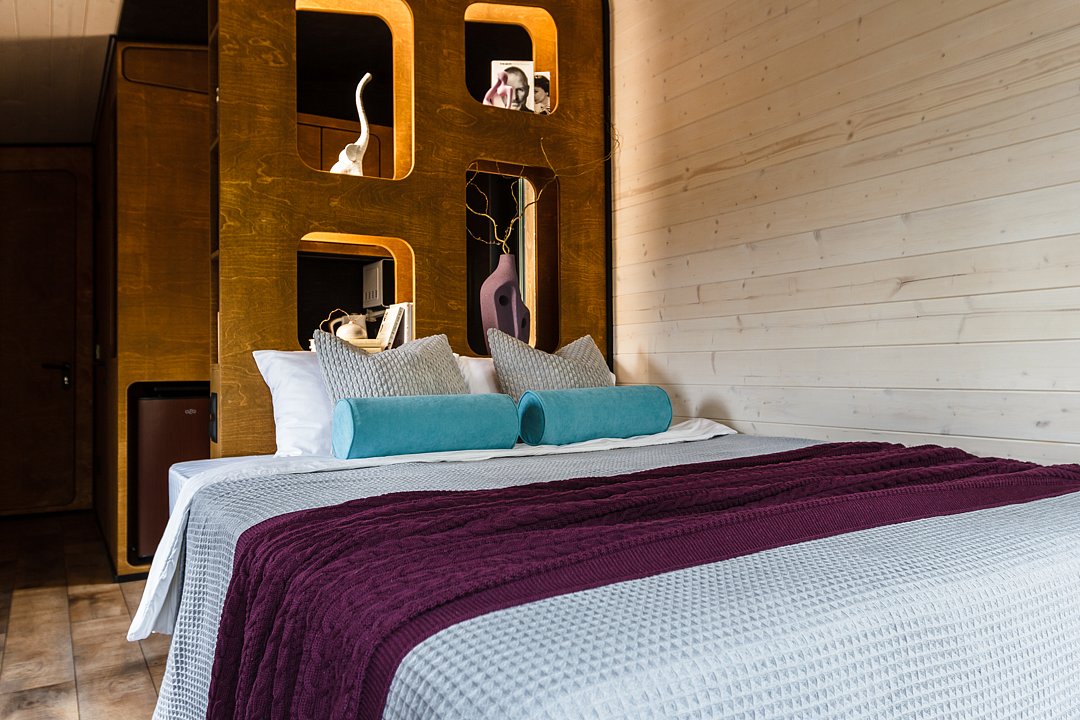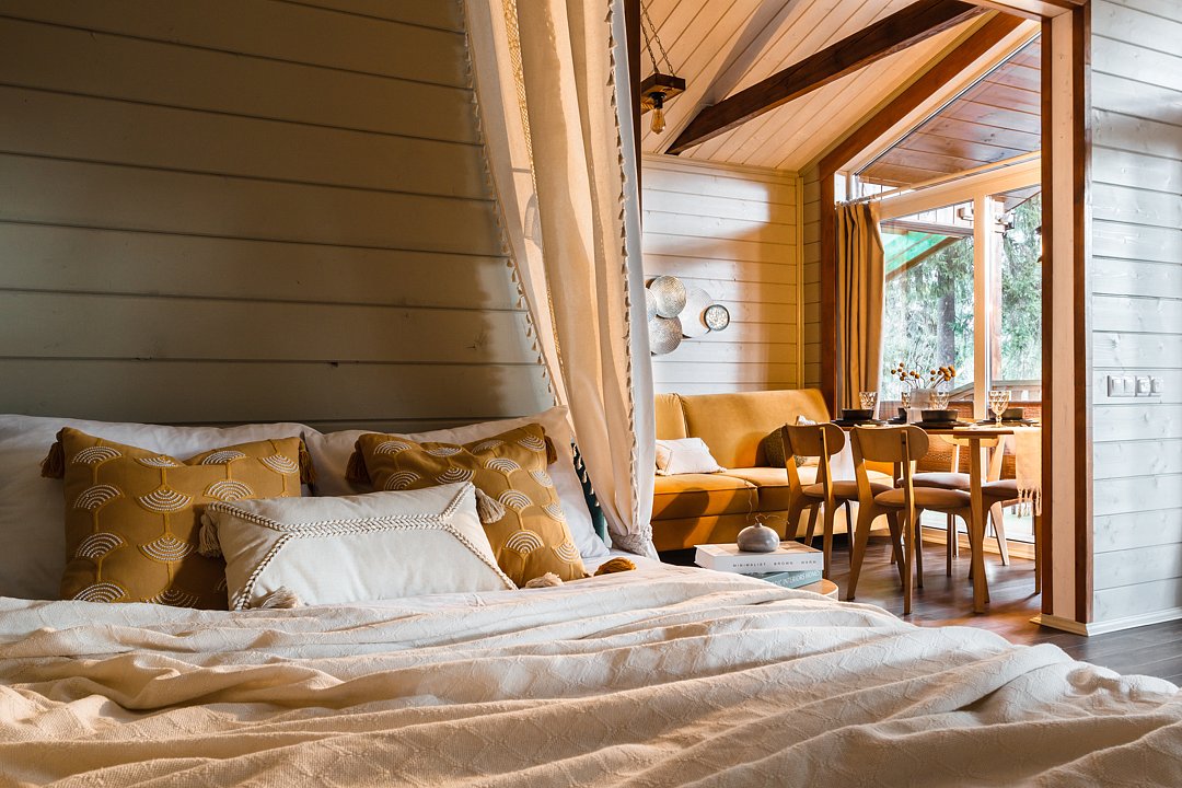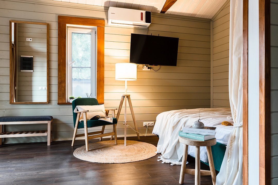 Дом полностью оснащен всем необходимым для комфортного отдыха в тишине и спокойствии. В зоне сна вас ждут удобные ортопедические матрас и подушки Askona, мягкое постельное, теплое одеяло. У кровати есть светильники, а также проектор для просмотра фильмов перед сном.