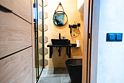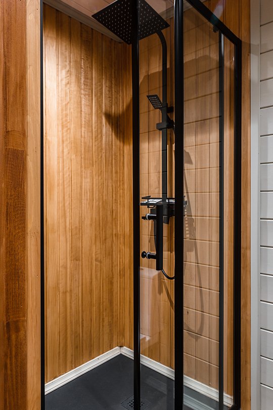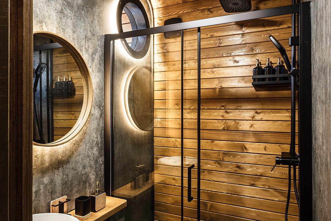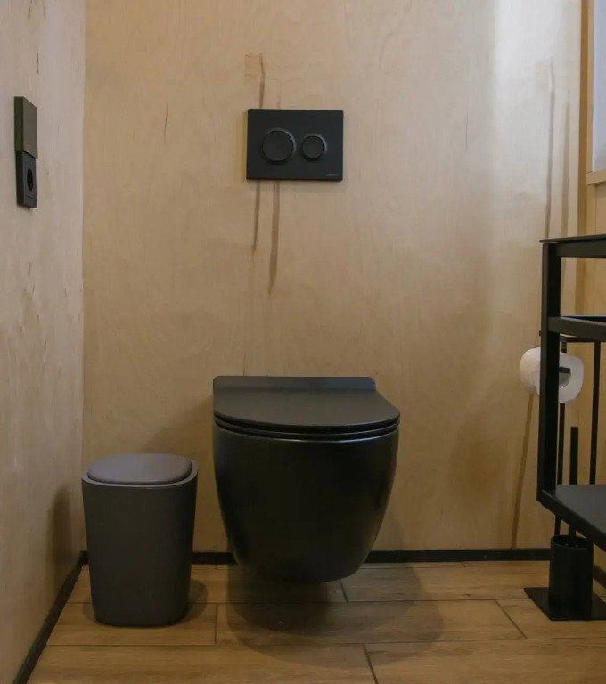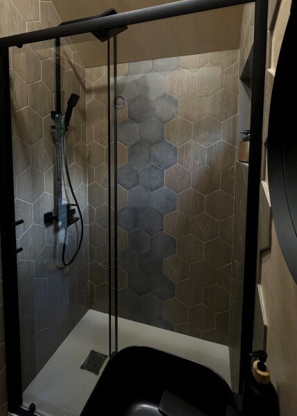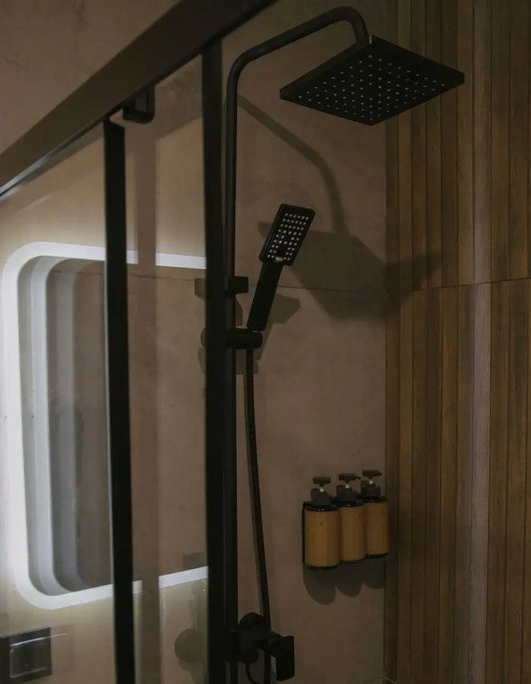 В ванной комнате вас ждет экзотическая душевая с зеркальным окном, где черные тона, дерево и камень гармонично сочетаются, создавая идеальное пространство расслабления. Для вашего удобства предоставляются все необходимые туалетные принадлежности: от зубной пасты до фена!
