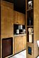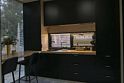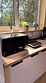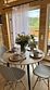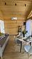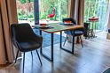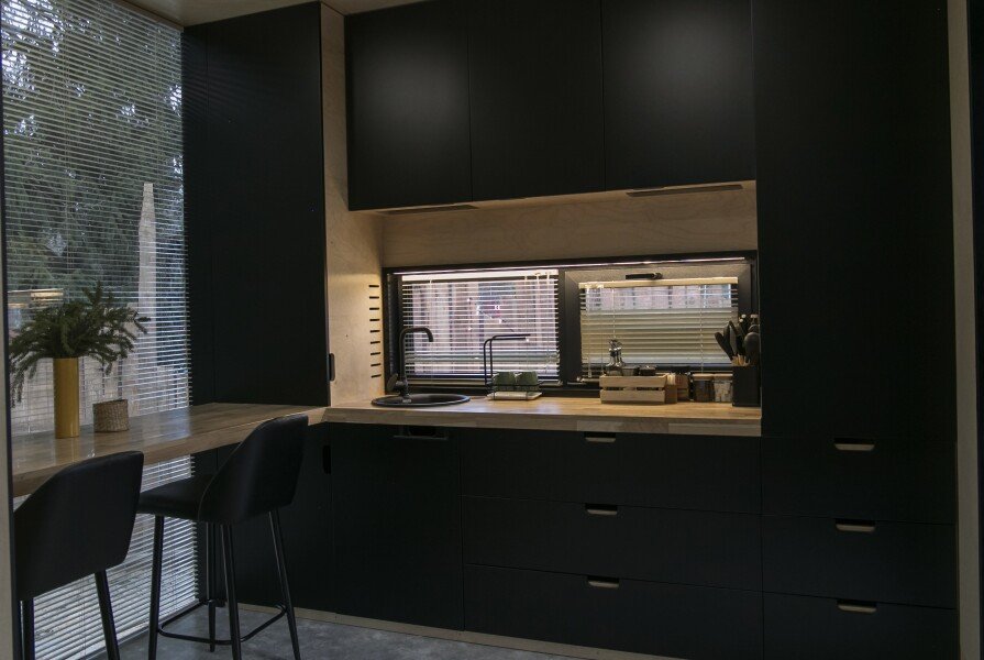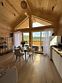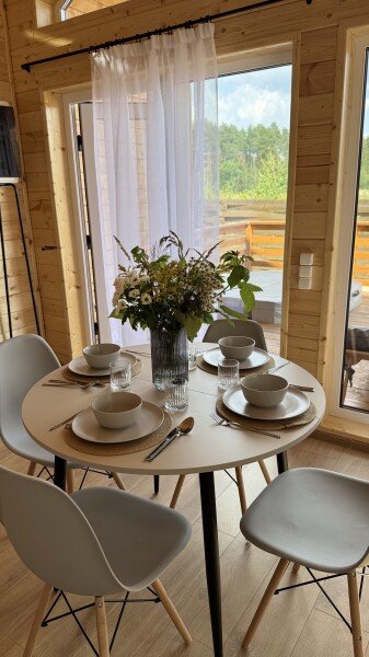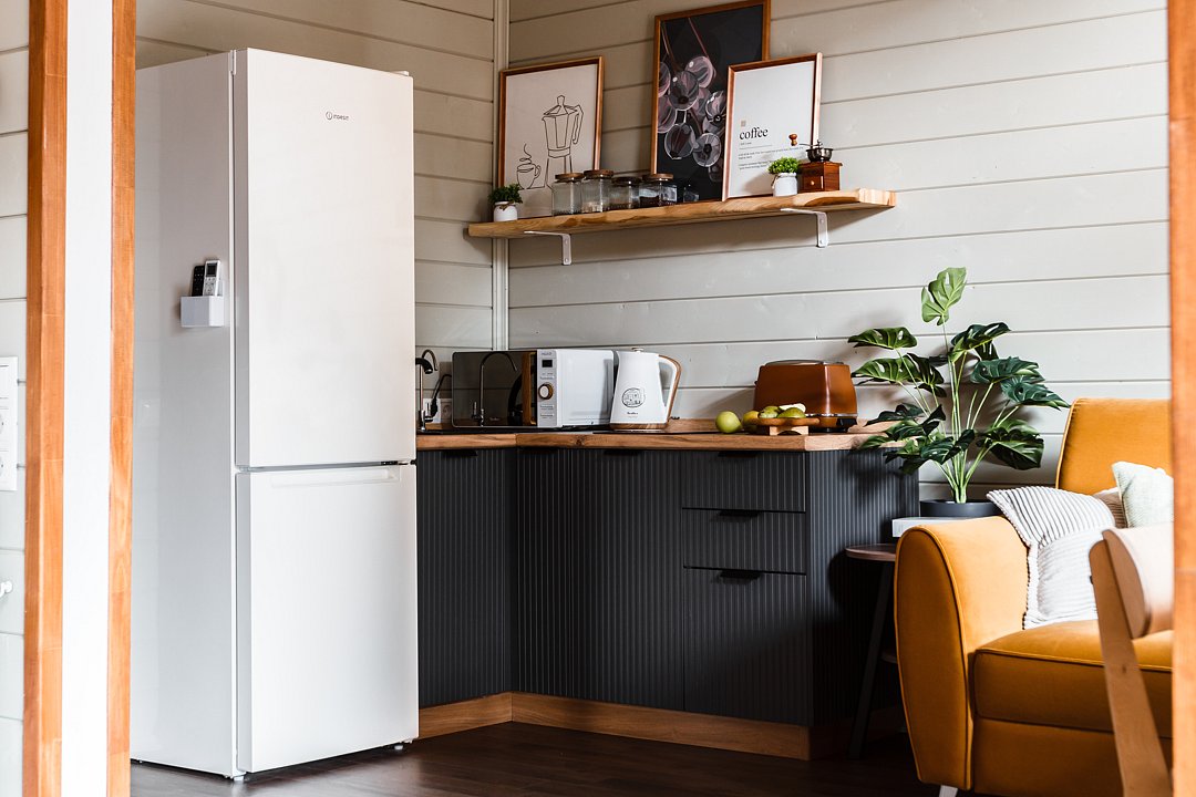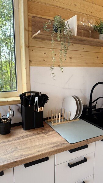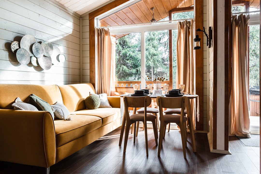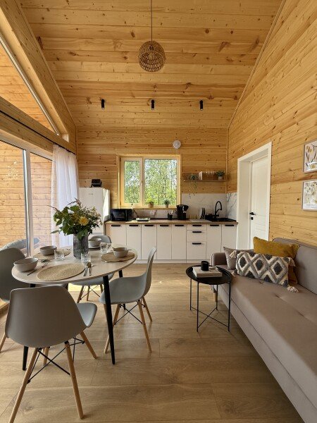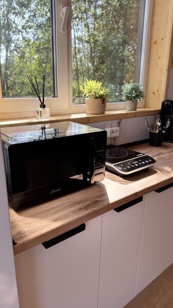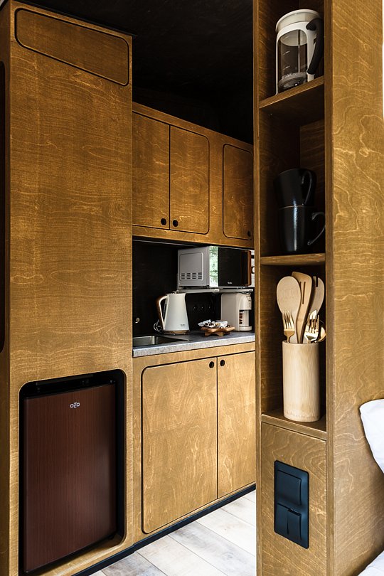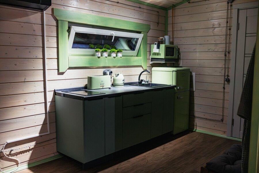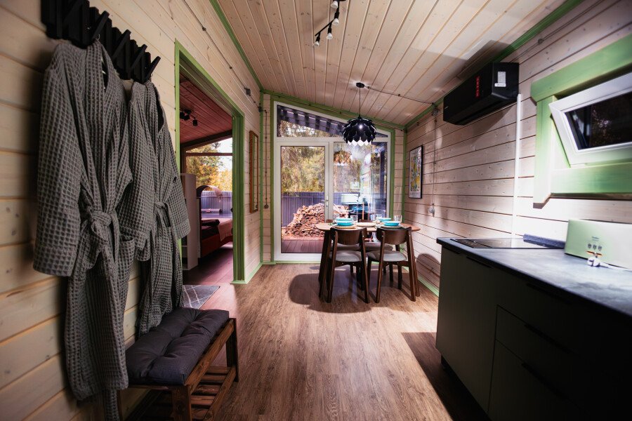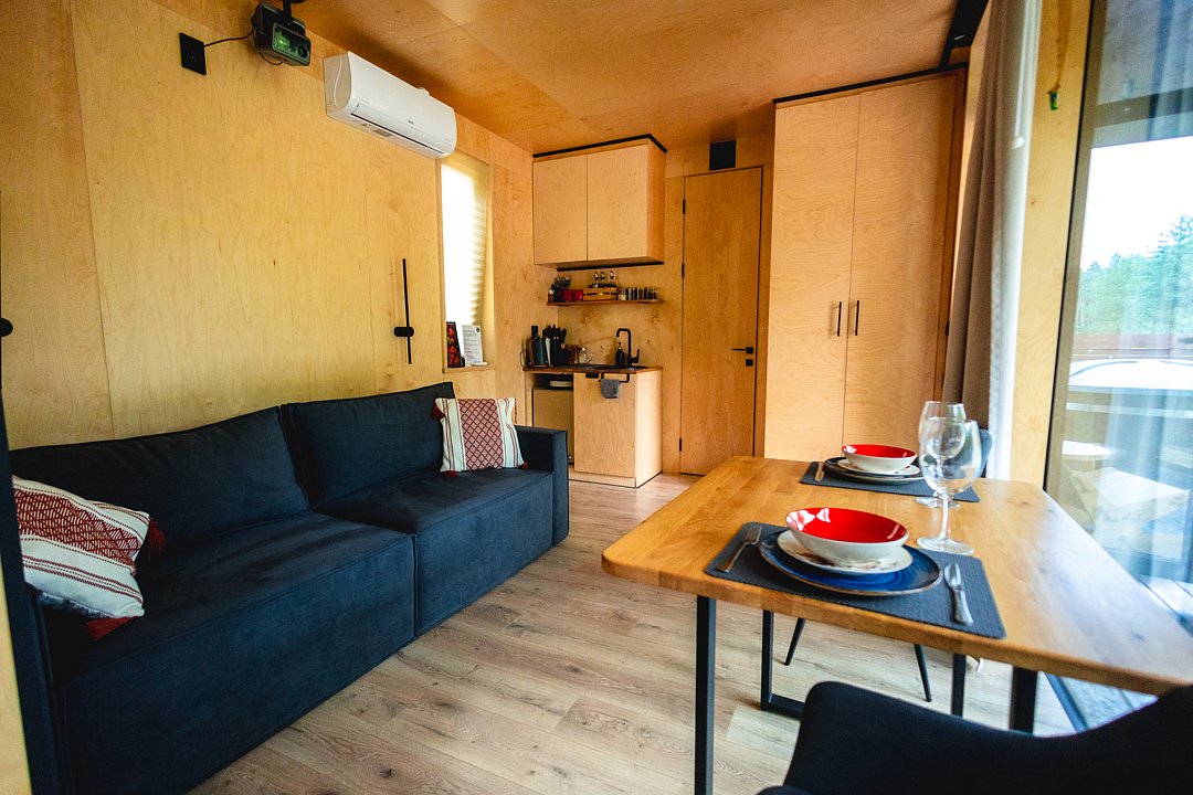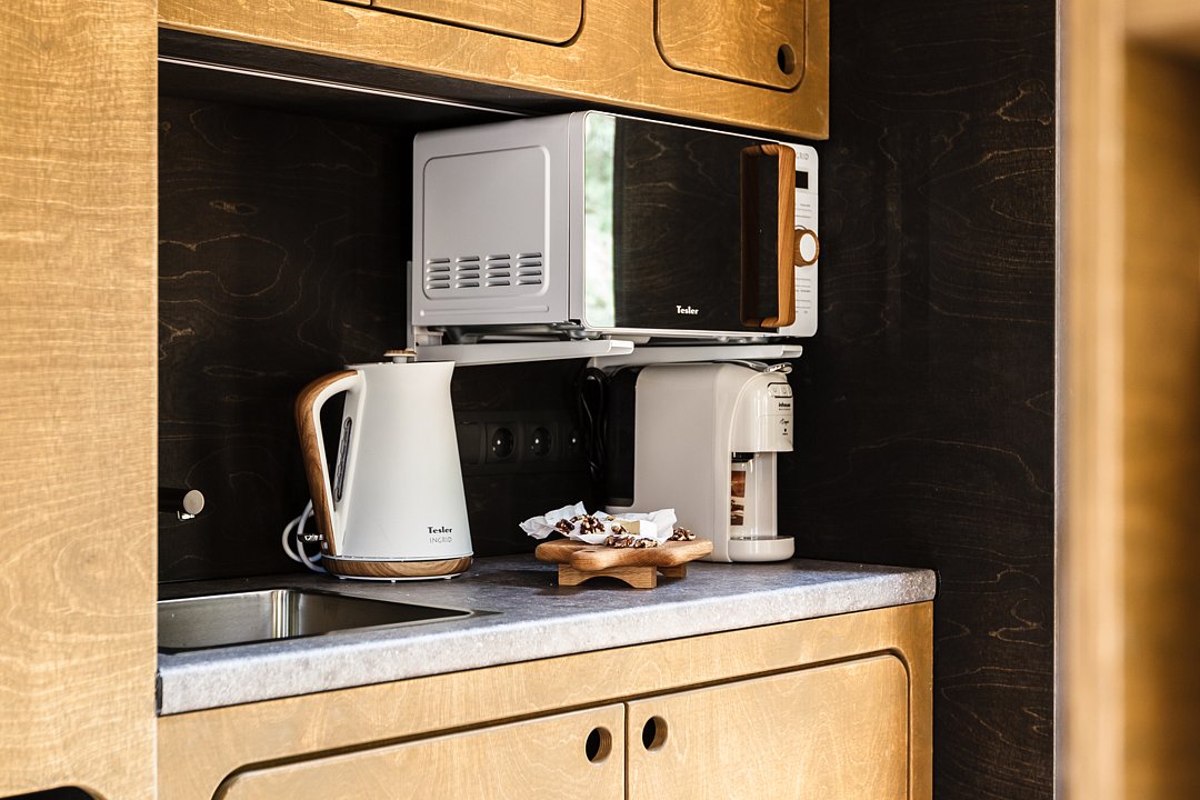 Внутри вас встретит современный интерьер, где кухня с барной стойкой идеально сочетается с зоной для сна. Панорамное окно открывает захватывающий вид на величественные ели, позволяя вам наслаждаться природой прямо из вашего уютного гнездышка. Кухня оснащена всем необходимым: от микроволновой печи и холодильника до кофемолки и гейзерной кофеварки. Здесь вы найдете разнообразные приправы, посуду и даже бокалы для шампанского — всё, что нужно для создания гастрономических шедевров.