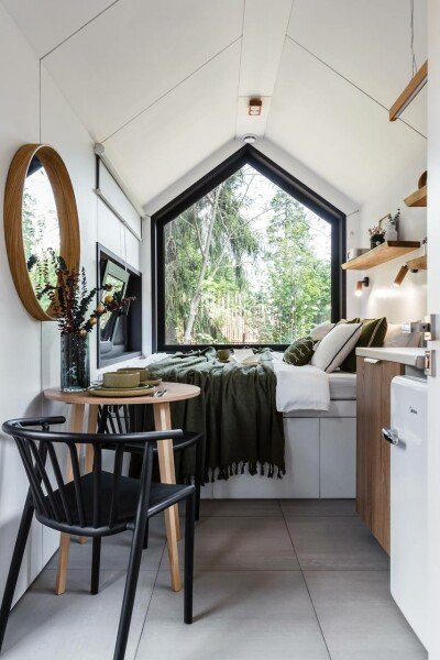 Светлый и стильный дом-студия с панорамным прикроватным окном, удобной двуспальной кроватью, ванной комнатой, мини-кухней и обеденной зоной.