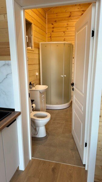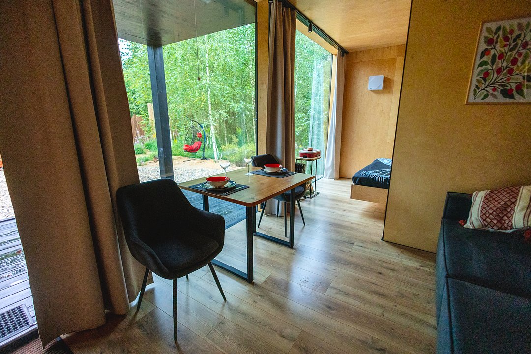 Стильный и уютный дом-студия с панорамным прикроватным окном, удобной двуспальной кроватью, ванной комнатой, мини-кухней и обеденной зоной. Дом полностью оснащен всем необходимым для комфортного отдыха в тишине и спокойствии.