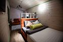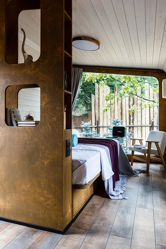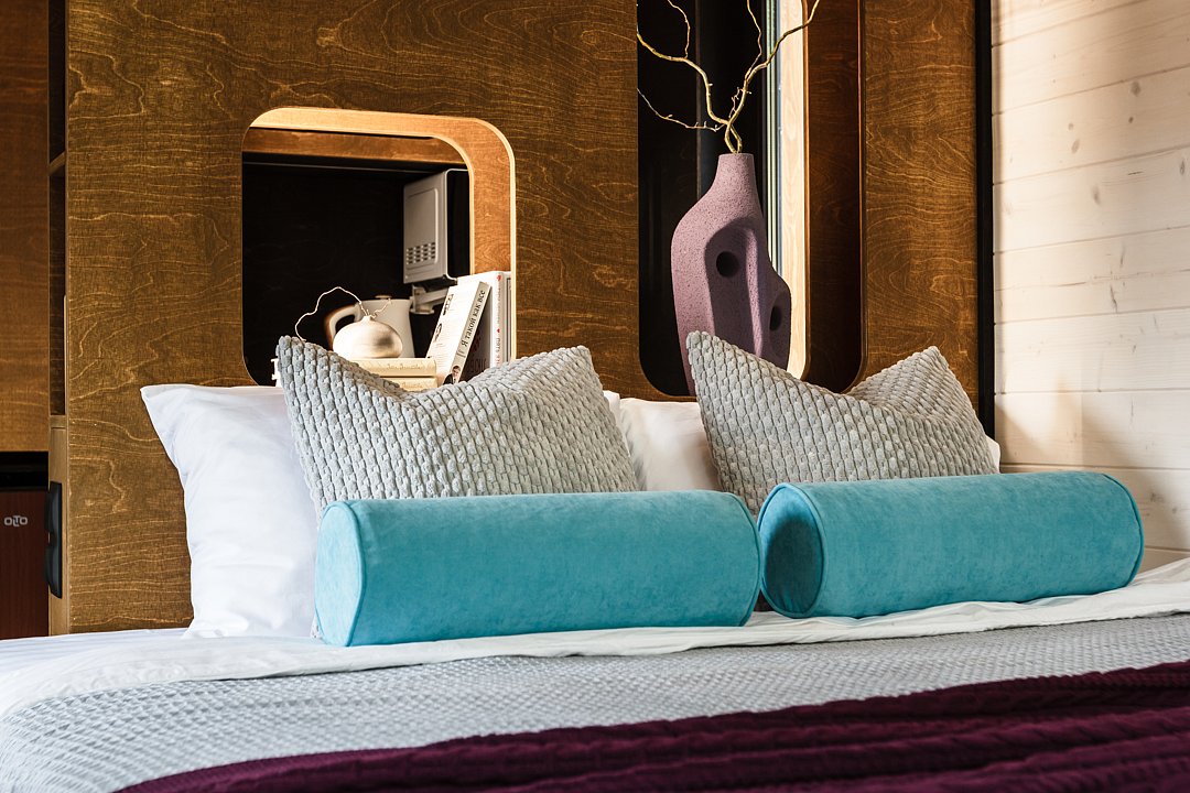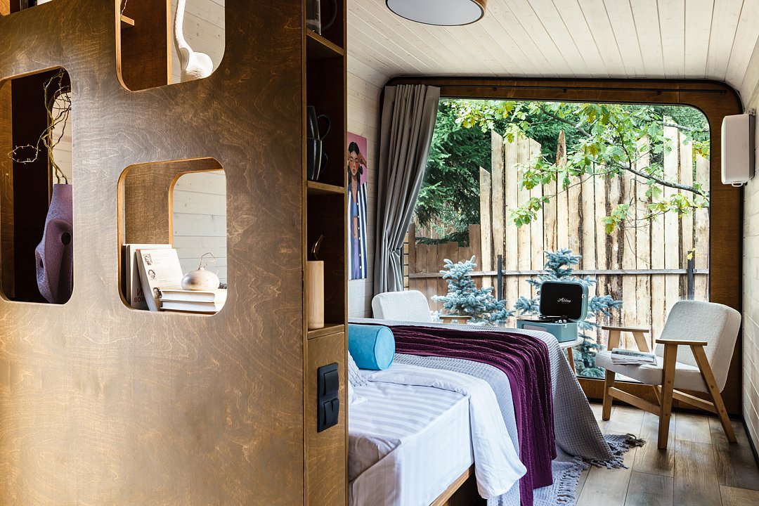 В зоне сна вас ждут удобные ортопедические матрас и подушка Askona, мягкое постельное, теплое одеяло. У кровати есть светильники и беспроводные зарядные устройства для телефонов, а также проектор для просмотра фильмов перед сном.