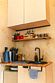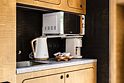 На кухне найдете мини-холодильник, микроволновую печь, караульную кофе-машину, чайник, индукционную плиту,