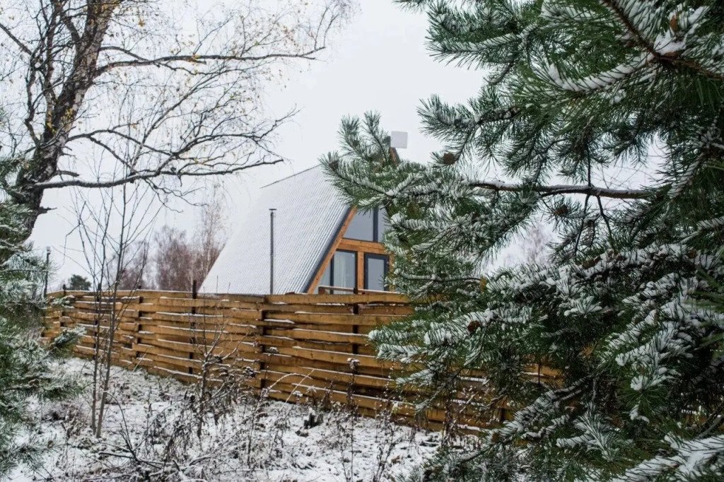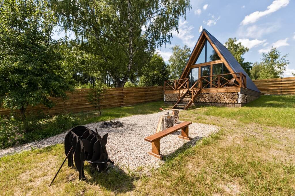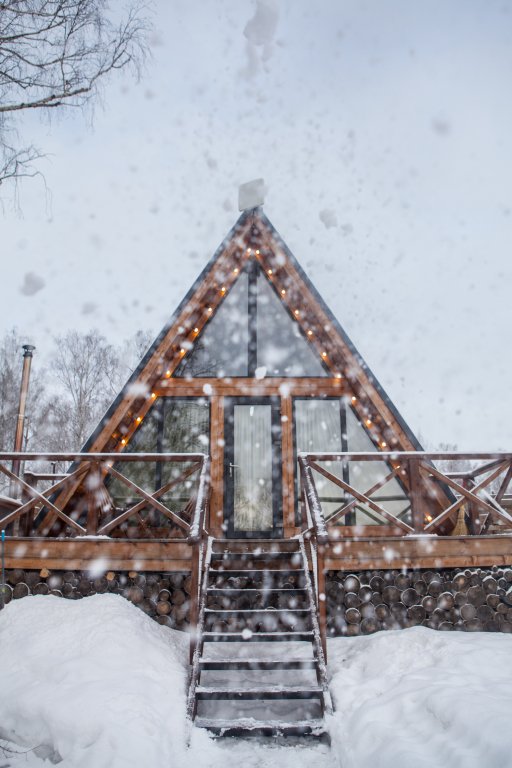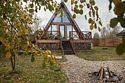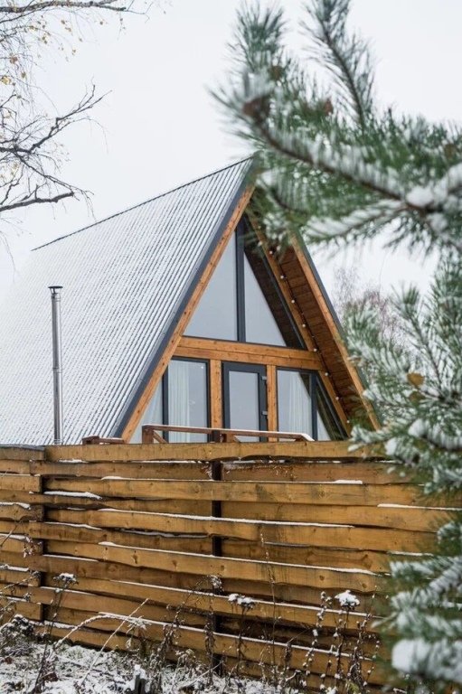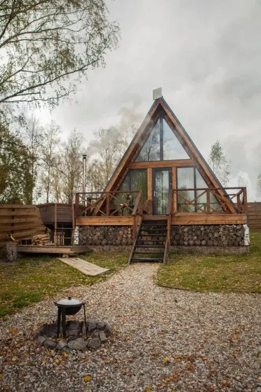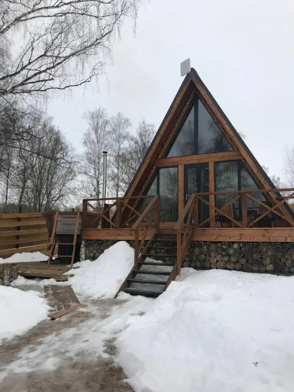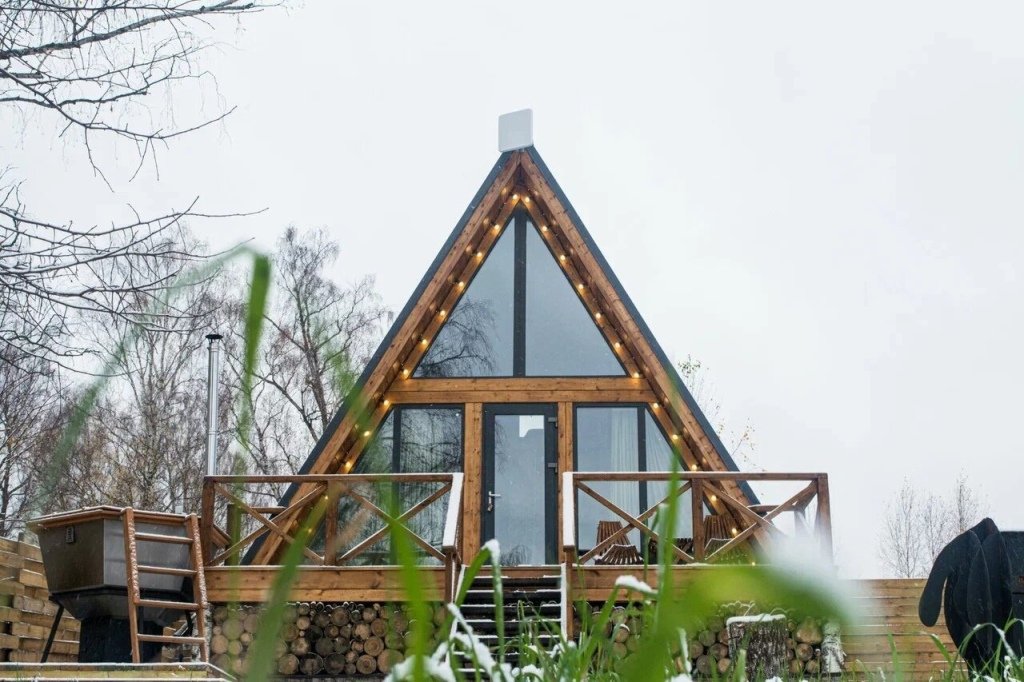 Двухуровневый треугольный домик для отдыха включает гостиную, объединенную с оборудованной кухонной зоной, спальню и санузел. Кухня полностью оборудована для разогрева и приготовления еды. В доме есть просторная терраса. На территории расположен мангал.