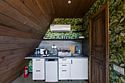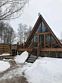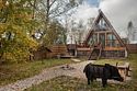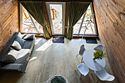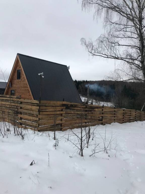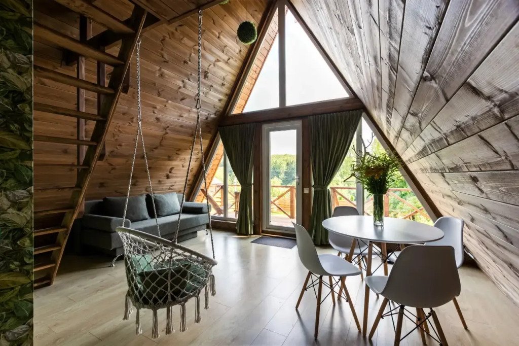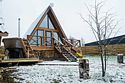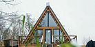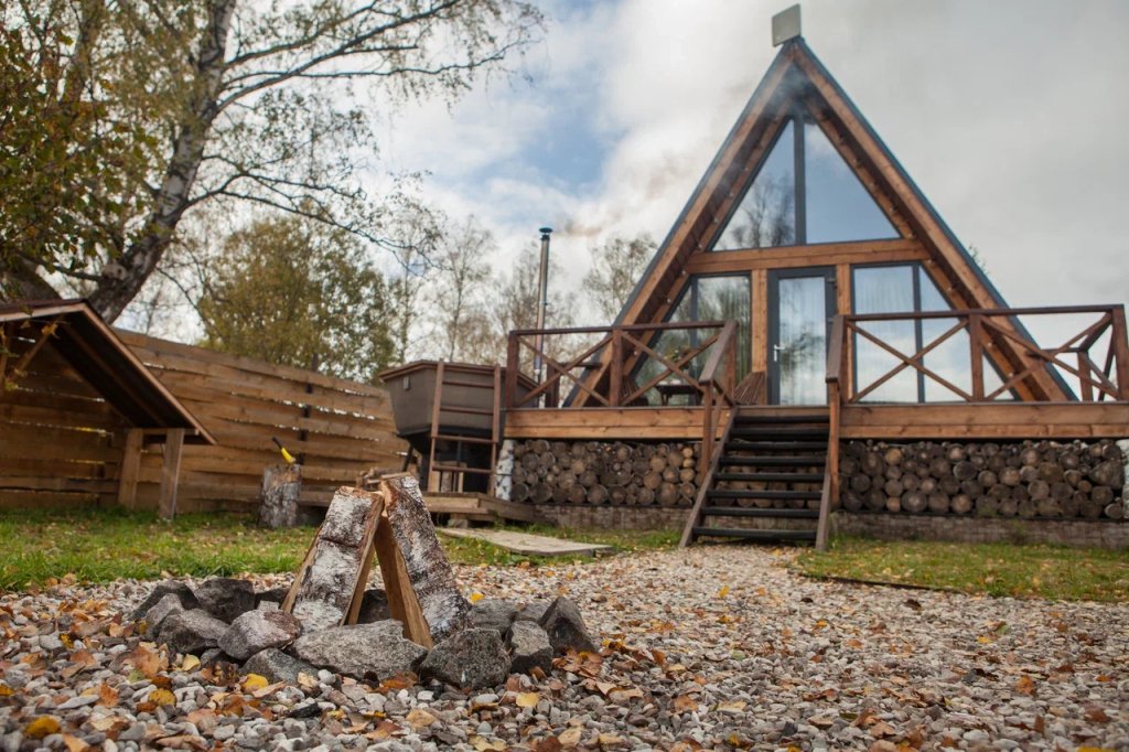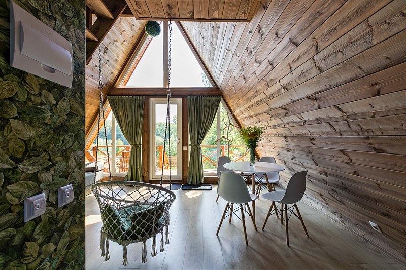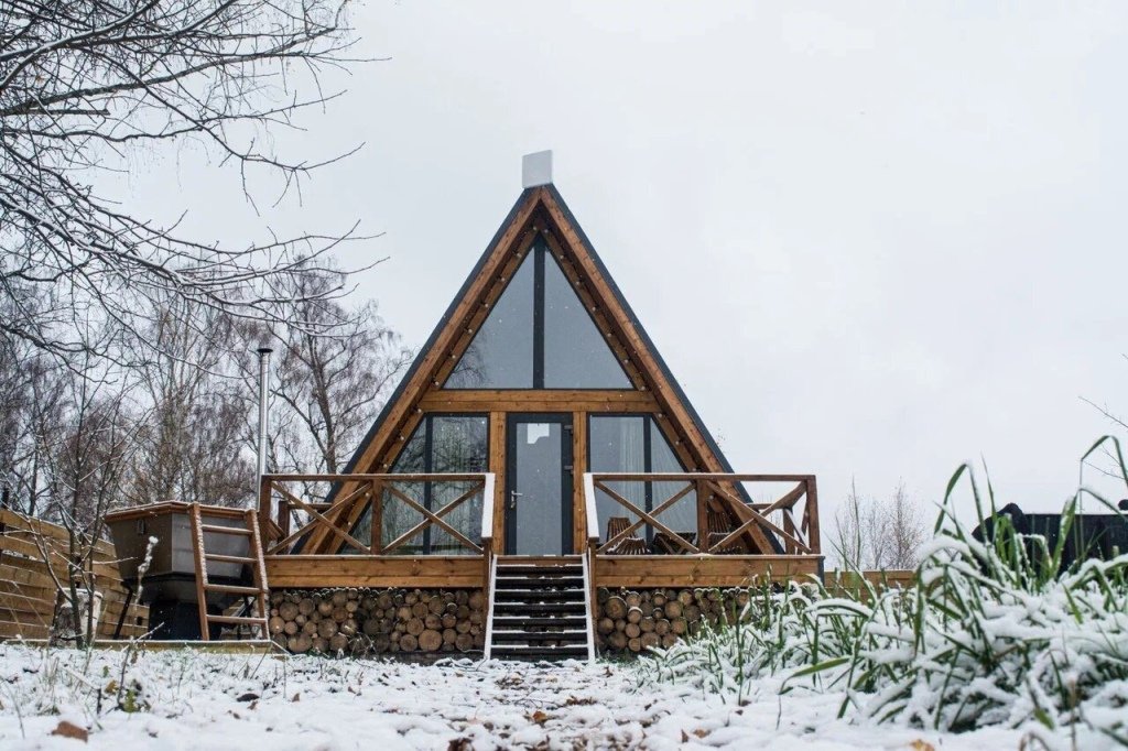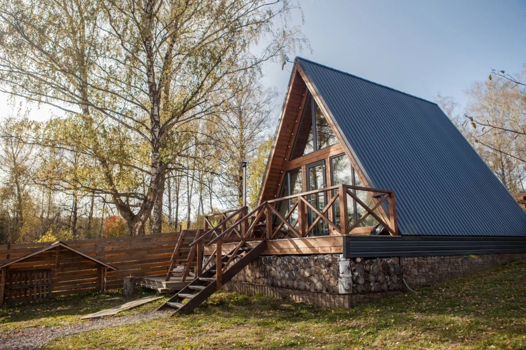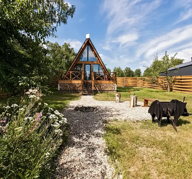 Двухуровневый треугольный домик для отдыха включает гостиную, объединенную с оборудованной кухонной зоной, спальню и санузел. Кухня полностью оборудована для разогрева и приготовления еды. В доме есть просторная терраса. На территории расположен мангал.