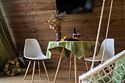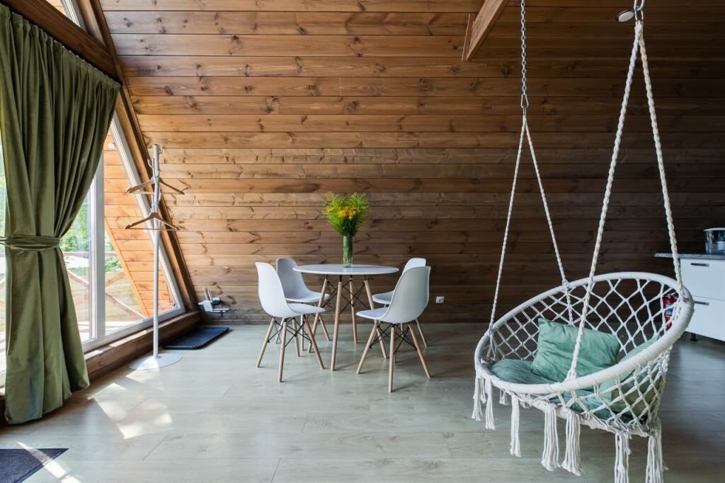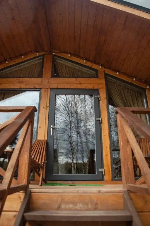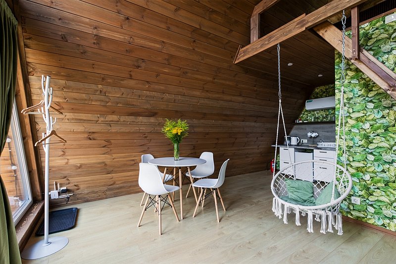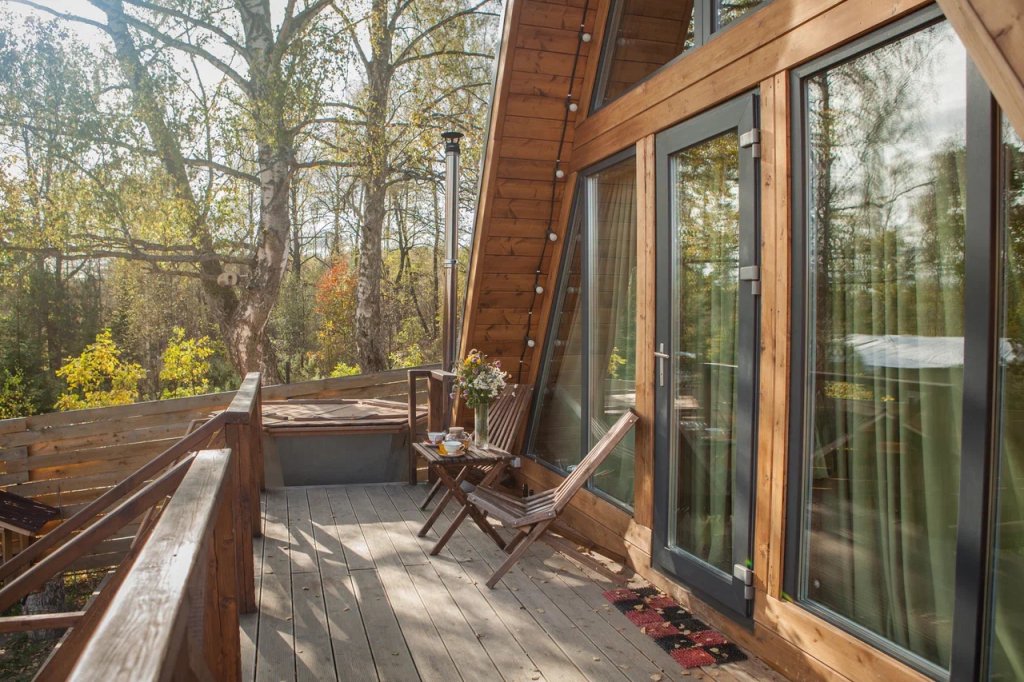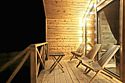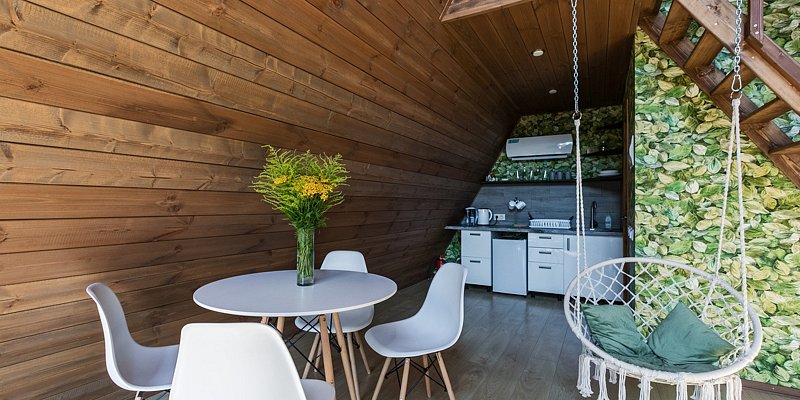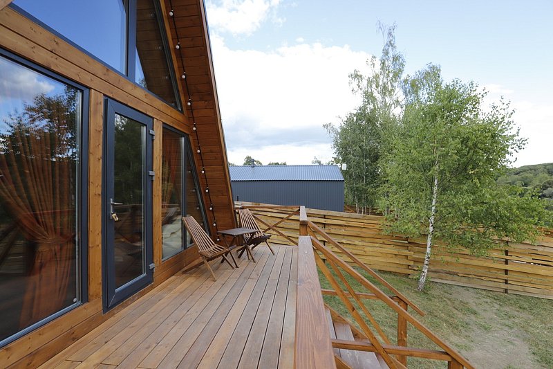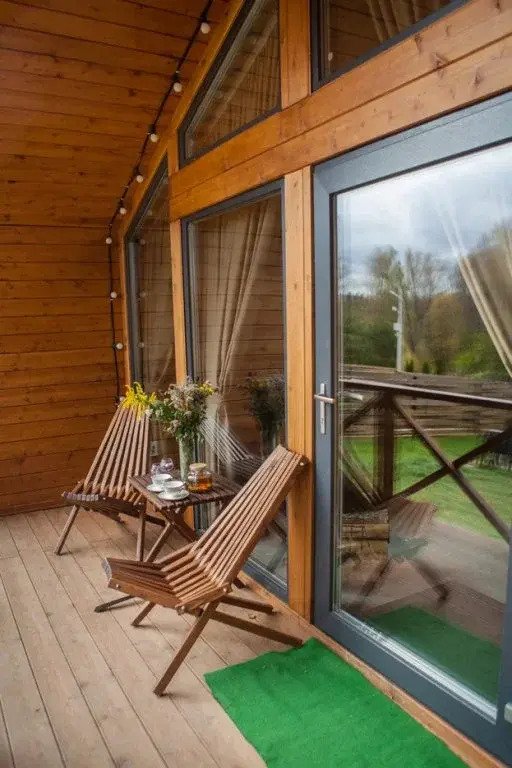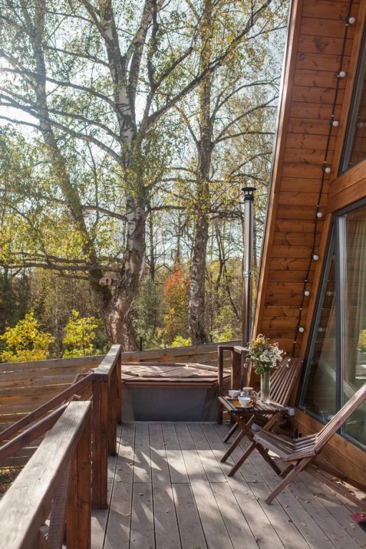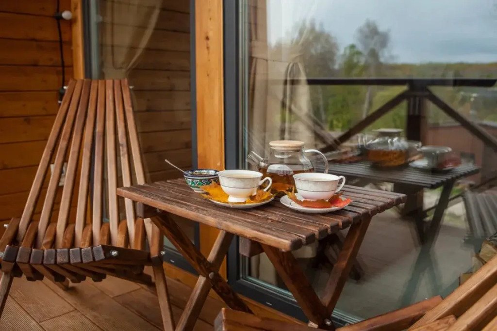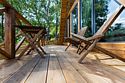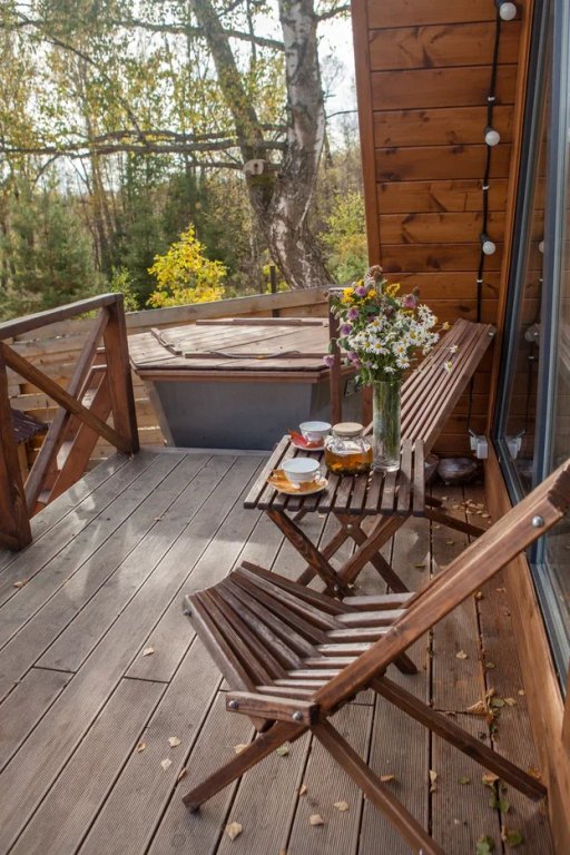На террасе расположены кресла для отдыха и стол, откуда вы сможете любоваться природой, рассветами и закатами над лесом.