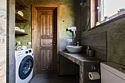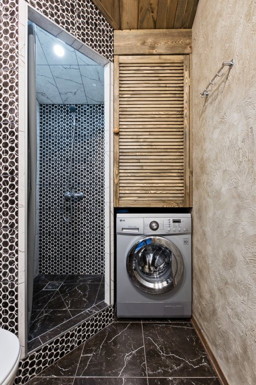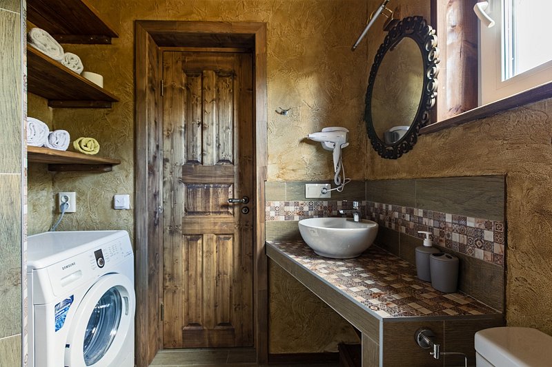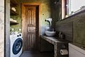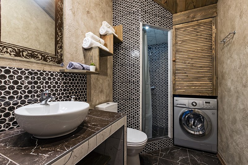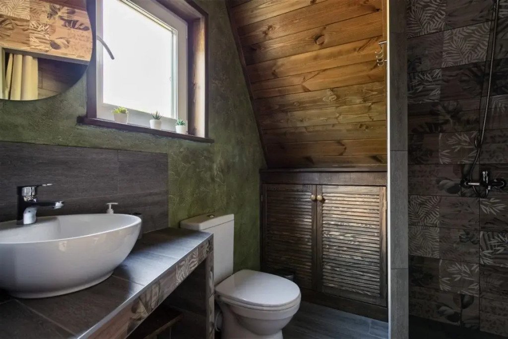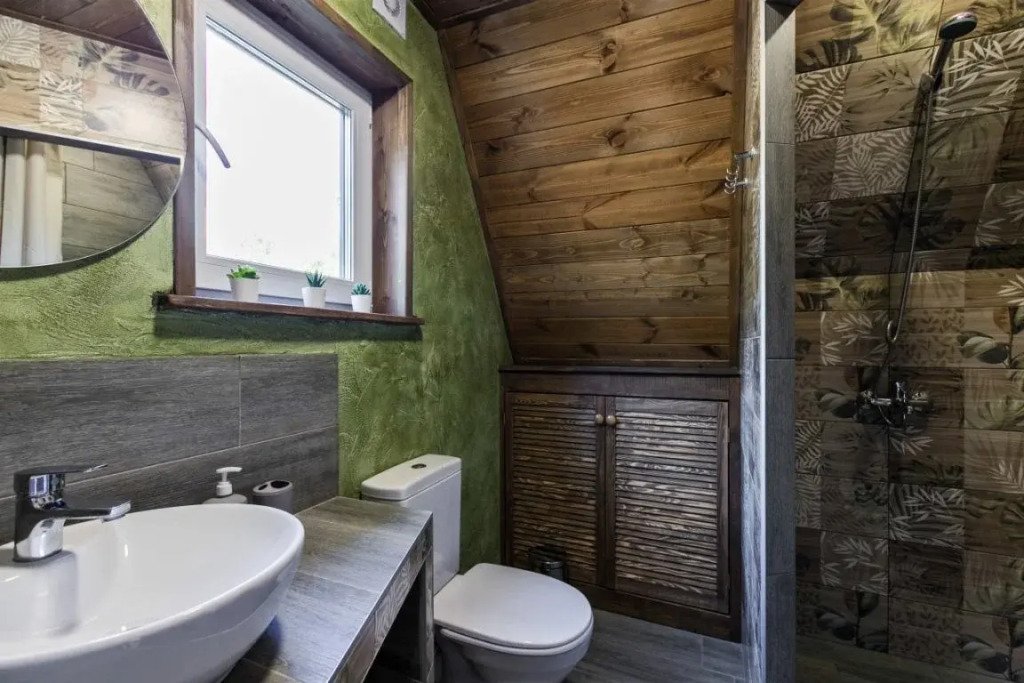 На кухне имеется вся необходимая утварь для приготовления пищи (посуда, плита, микроволновая печь, раковина, столовые приборы, кастрюли, сковорода, а также специи, чай). Санузел треугольного дома оборудован теплым полом, душевой кабиной в плитке, раковиной, полотенцесушителем, также в наличии фен, жидкое мыло и другие гигиенические принадлежности.