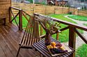 На огороженной территории коттеджа собственная мангальная зона со всем необходимым для приготовления еды (шампура, решетка, дрова, топор, казан). А на террасе расположены кресла для отдыха и стол.