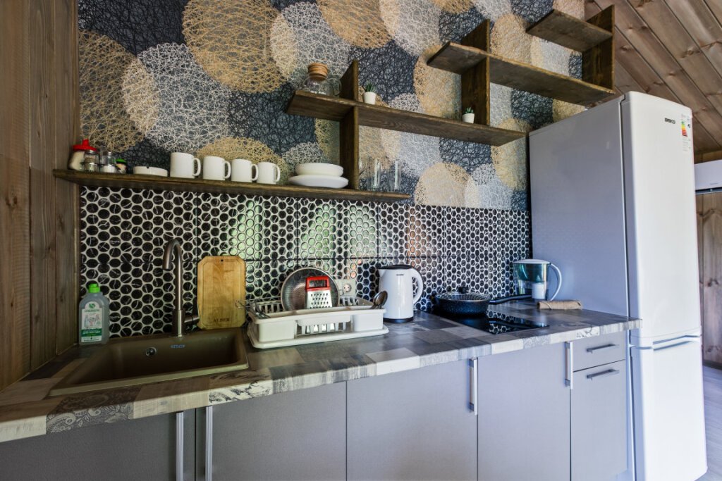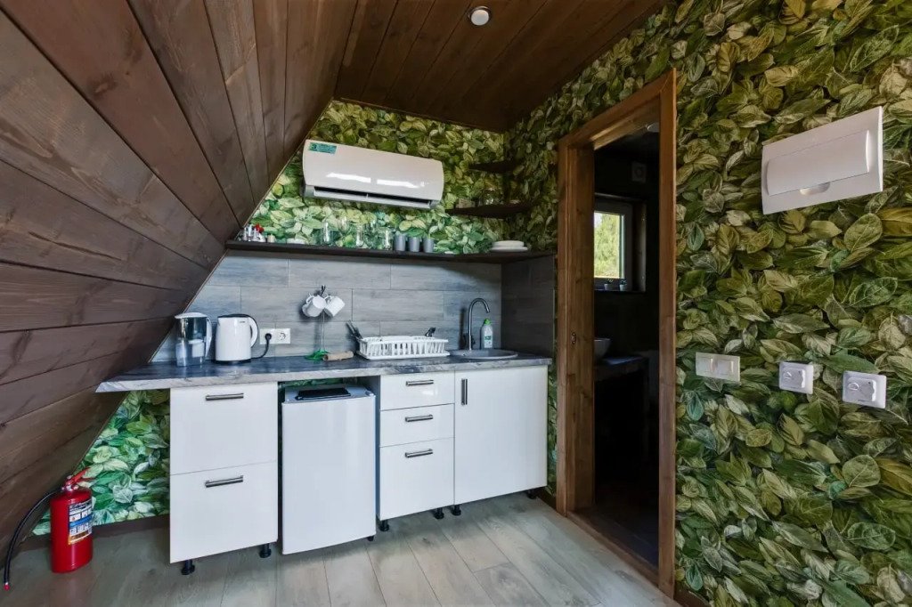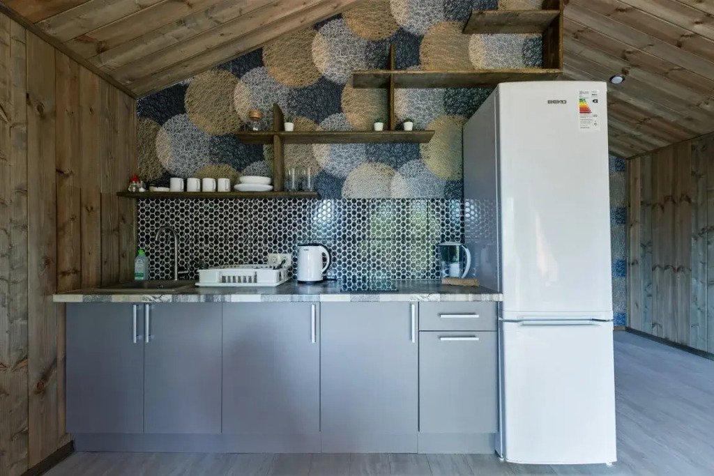 На кухне имеется вся необходимая утварь для приготовления пищи (посуда, плита, микроволновая печь, раковина, столовые приборы, кастрюли, сковорода, а также специи, чай). Санузел оборудован теплым полом, душевой кабиной в плитке, раковиной, полотенцесушителем. Также в домике в наличии фен, жидкое мыло и другие гигиенические принадлежности.