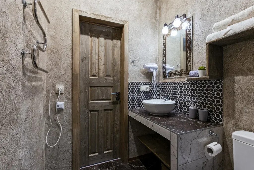В доме имеется кондиционер и теплый пол, а также телевизор со Smart TV. В холодное время года можно разжечь камин и любоваться, сидя на диване, огнем, слушая потрескивание дров.