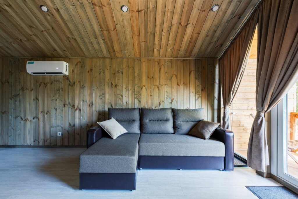 В отделке дома в стиле барнхаус используются холодные зимние оттенки, однако интерьер подчеркивает, что несмотря на погоду, в доме очень уютно и тепло. В доме имеется кондиционер и теплый пол, а также телевизор со Smart TV.