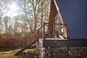 Двухуровневый домик шалаш отлично подходит тем, кто любит отдых в лесу, на природе, но не готов мириться с отсутствием привычного комфорта. Дизайн выполнен в осенних тонах, а аромат натурального дерева погружает в атмосферу красочной осени вне зависимости от времени года и способствуют качественному отдыху.