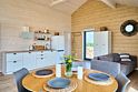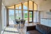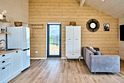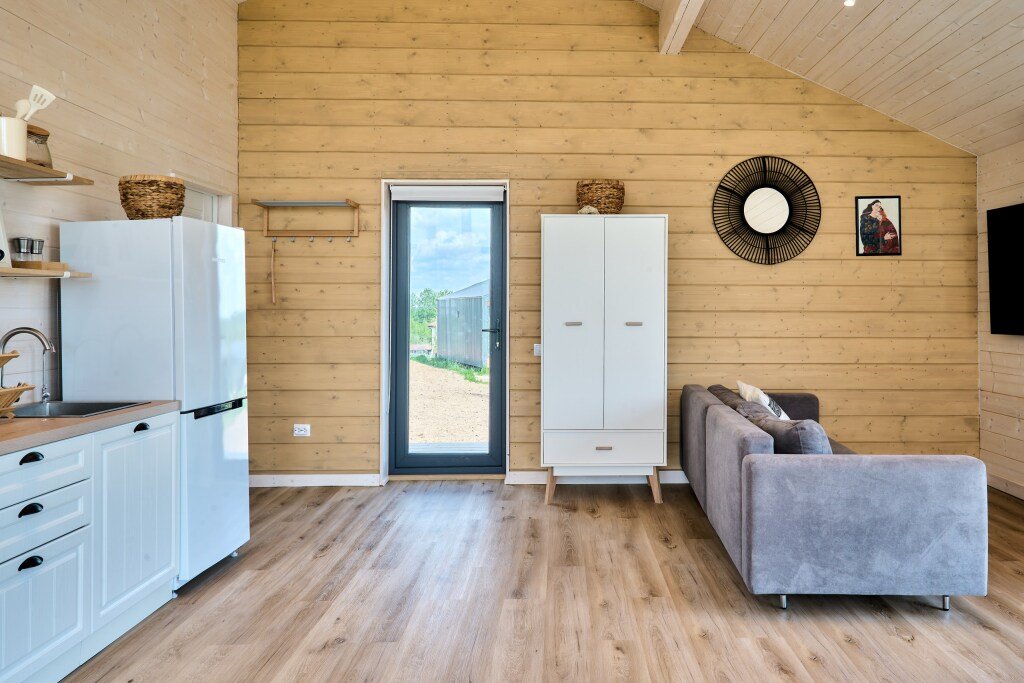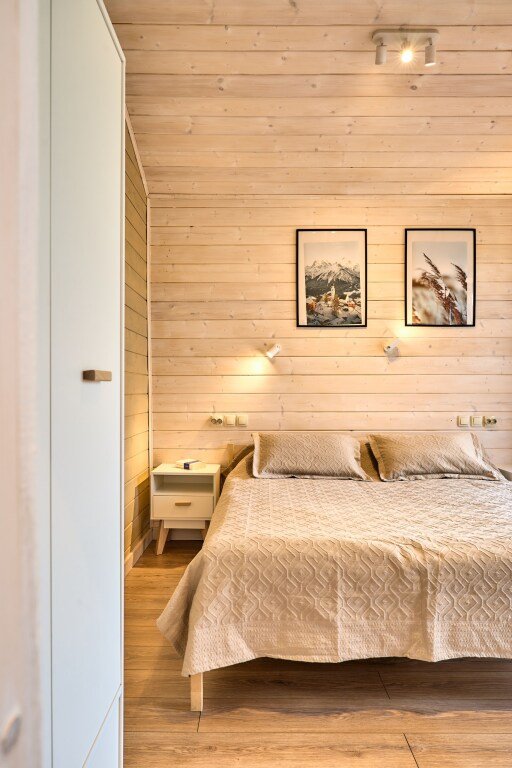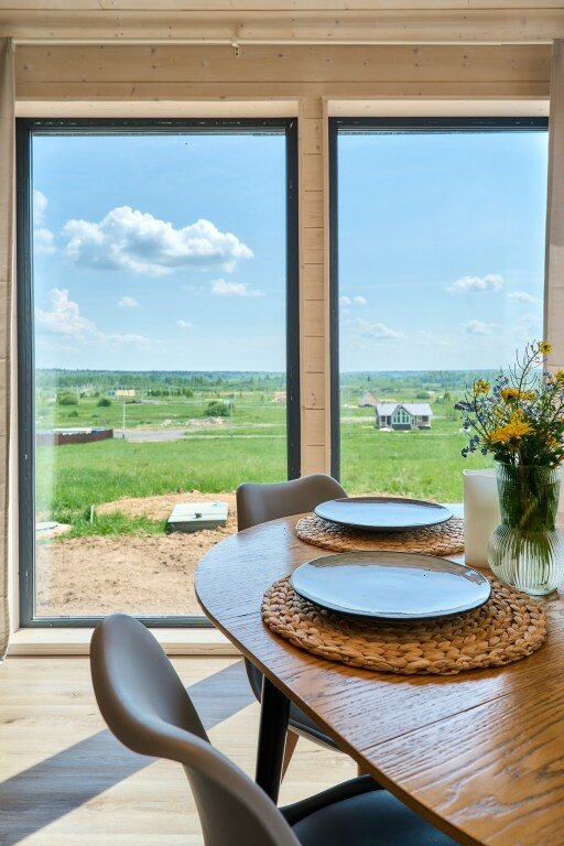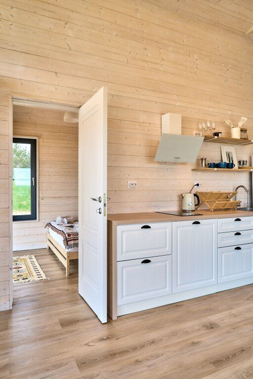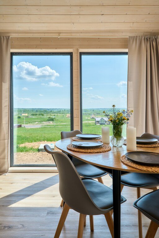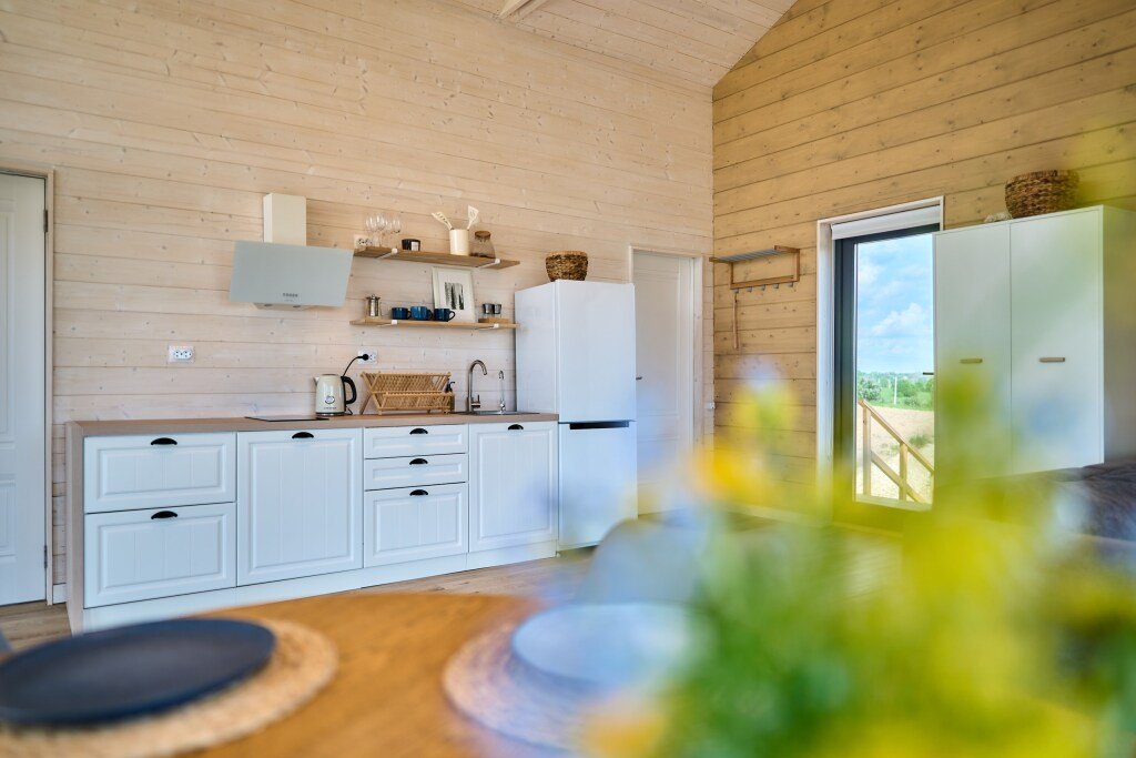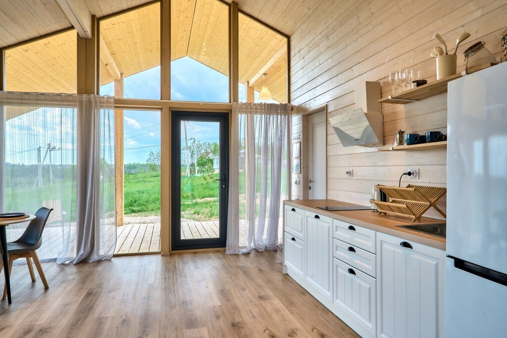 Дом предназначен для проживания гостей, оборудован необходимыми удобствами. В распоряжении гостей одна спальня с двуспальной кроватью, кухня-гостиная с раскладным диваном, высокие потолки — 5 м в коньке, а также панорамные окна. В доме есть постельное бельё из хлопка, полотенца и средства гигиены; для приготовления пищи предусмотрена микроволновая печь. На участке размещены мангал, костровая чаша и уличная мебель.