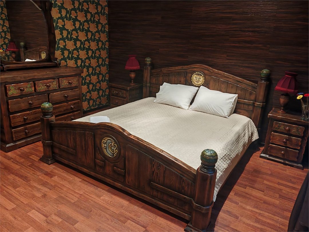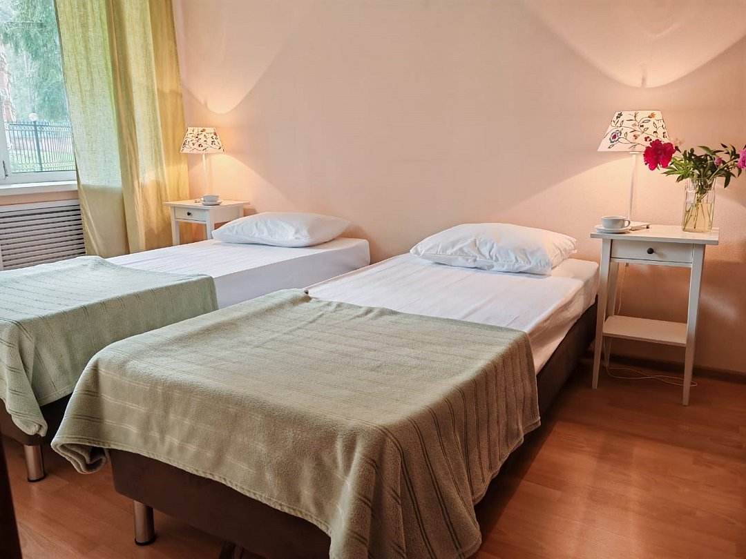 Однокомнатный номер: в комнате две полутороспальные кровати или двуспальная кровать (на выбор). Индивидуальный душ, туалет, стол, стулья, комод для одежды.