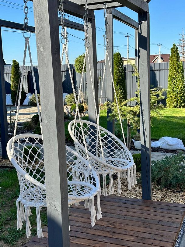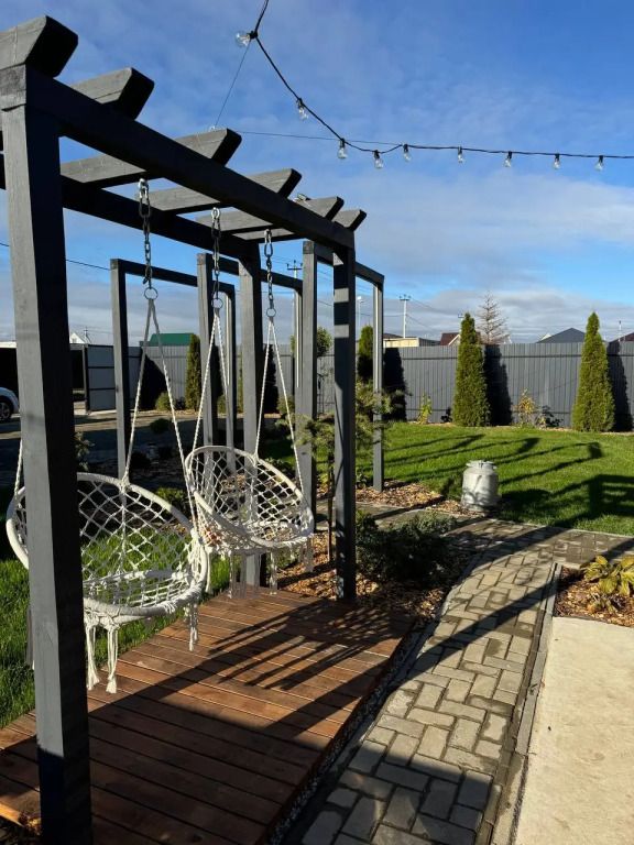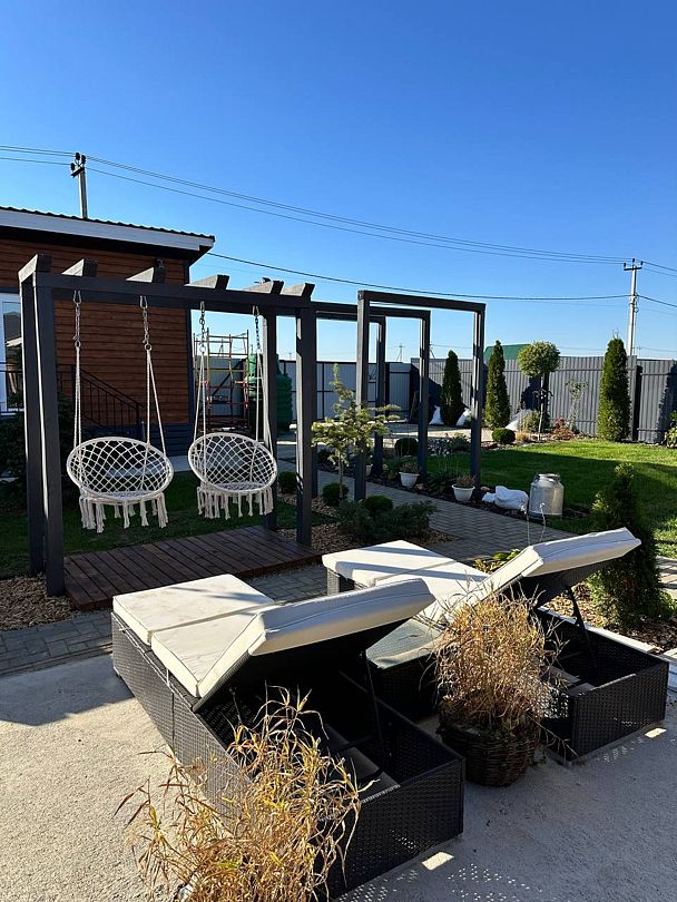 Большая территория с лежаками и качелями.
