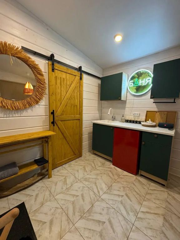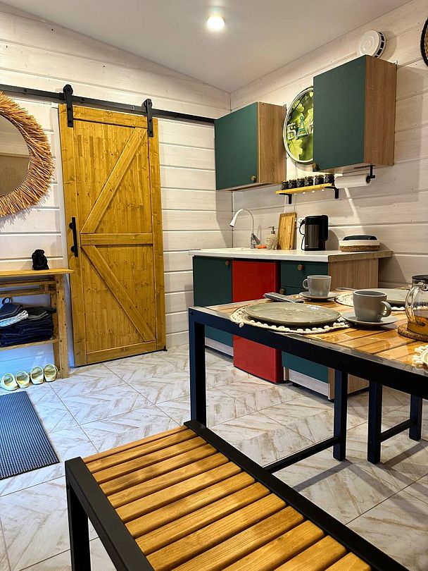 Внутри бани имеется кухня с холодильником и кухонными принадлежностями для 4 гостей.