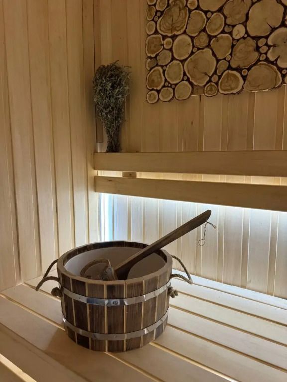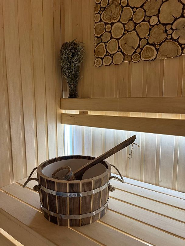 Парная из натуральное липы наполнена мягким древесным ароматом, дополнительные нотки дает аромат спилов можжевельника на стенах. Температура здесь поднимается до 95 градусов, а с помощью воды легко регулировать влажность воздуха и делать либо сухую финскую сауну либо классическую русскую баню.