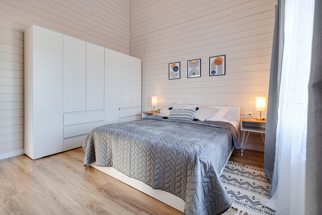 - Две уютные спальни — кровати с ортопедическими матрасами, постельное бельё и большой вместительный шкаф для вещей.