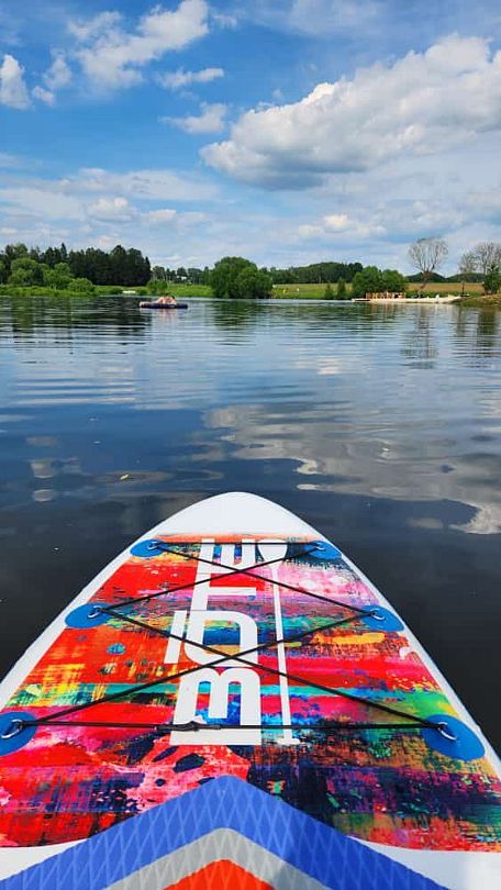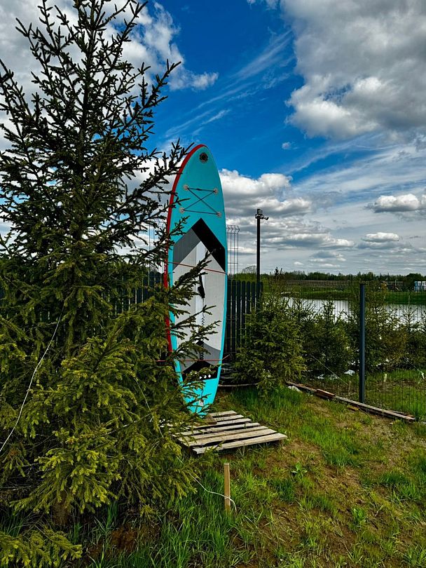 Гости могут взять сапборд и насладиться прогулкой по зеркальной поверхности водоема. Однако для безопасности необходимо надеть спасательный жилет.