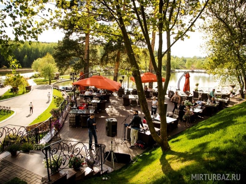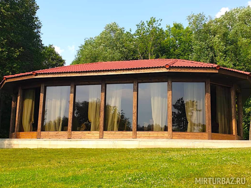 Отличное решение для небольшой свадьбы или другого торжества. Удачное расположение беседок у пруда и панорамное остекление создает естественные декорации, где главный элемент это природа.