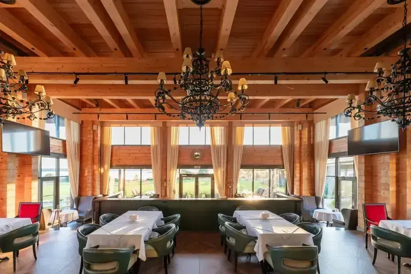 В комплексе работает ресторан, где подаются блюда европейской и русской кухни. В ресторане — панорамные окна, есть летняя терраса и гастро-павильон с печью.