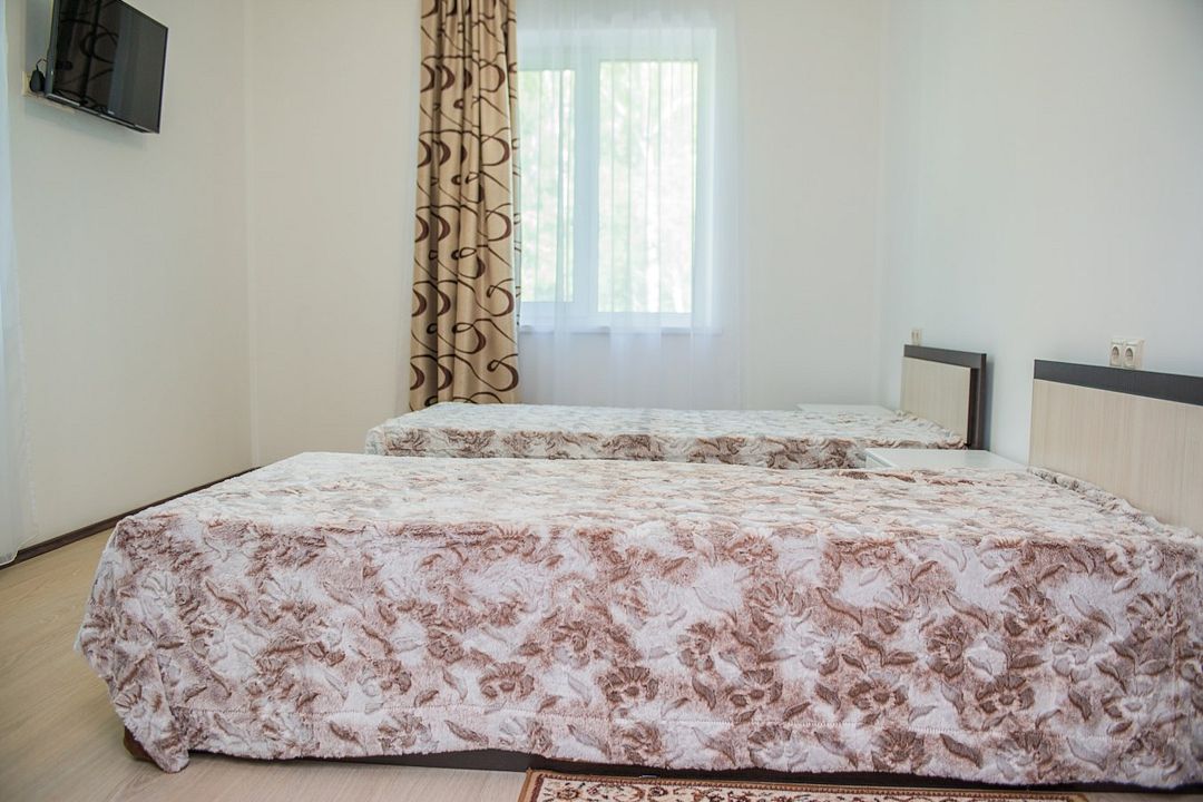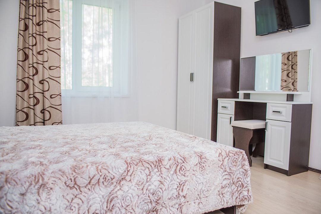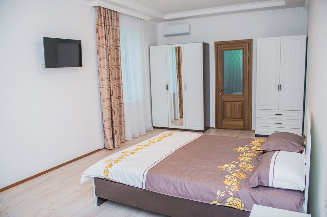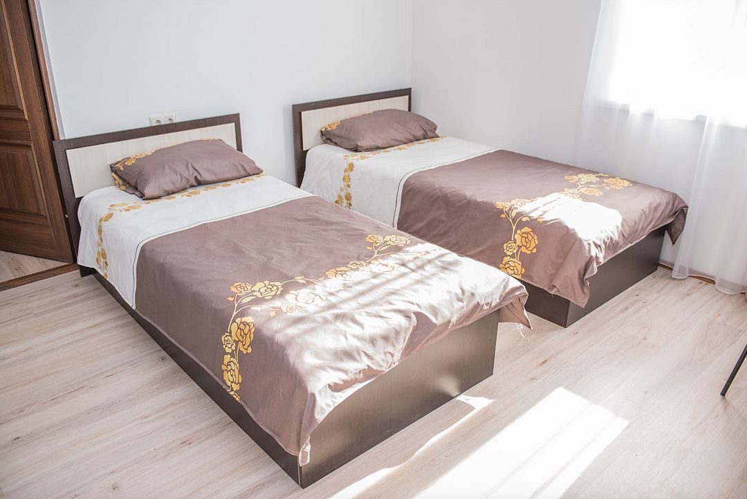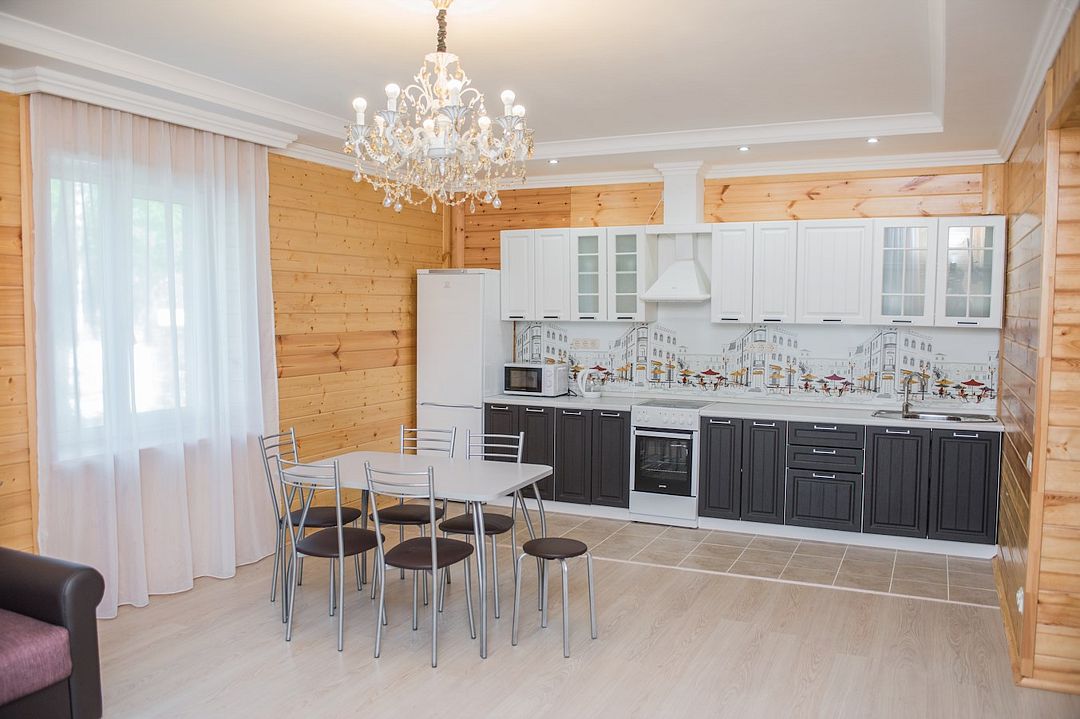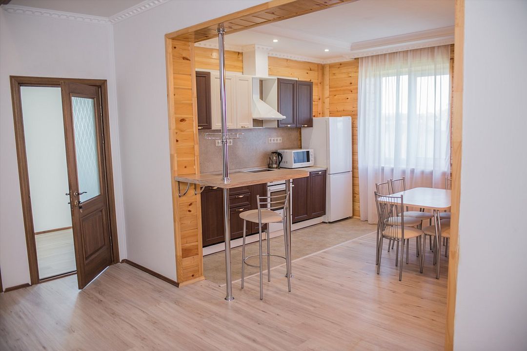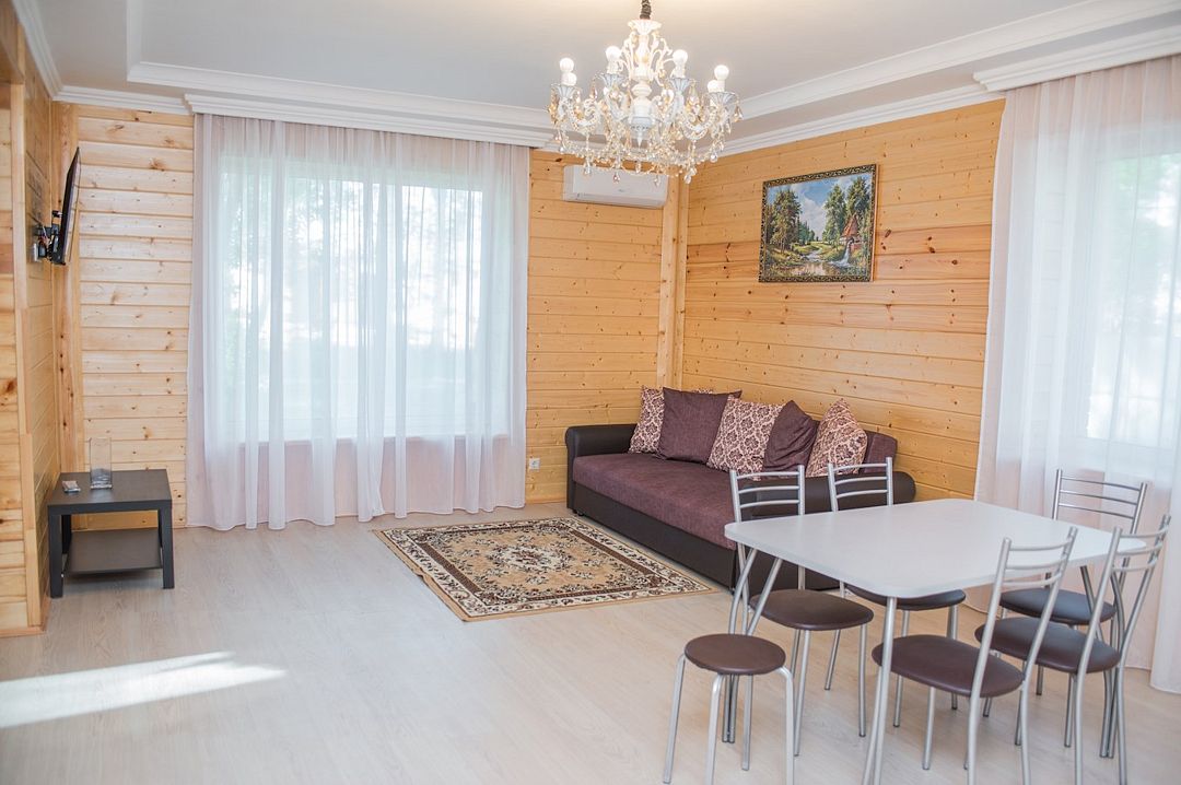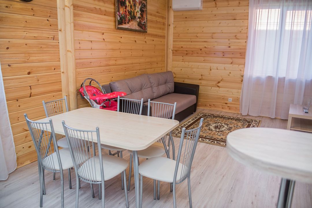 Просторный номер с обеденной зоной (без плиты), спальней и собственным санузлом. В номере две кровати: двуспальная и отдельная детская. Преимущества номера: тёплый пол, кондиционер, горячая вода, wi-fi.