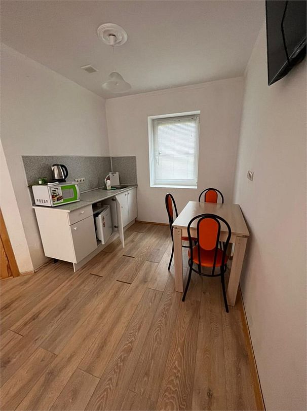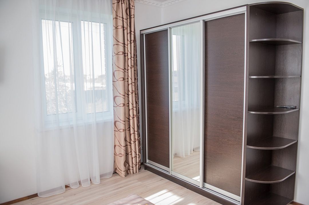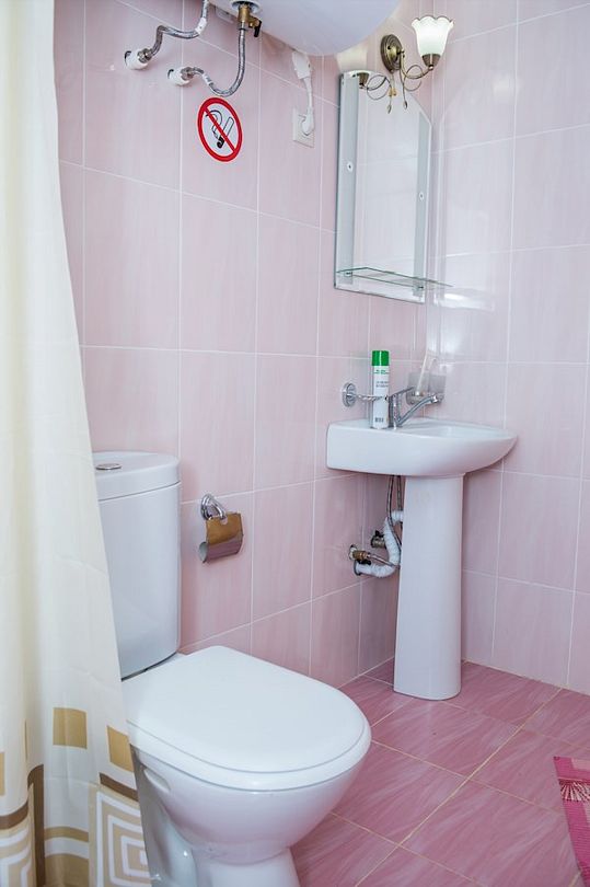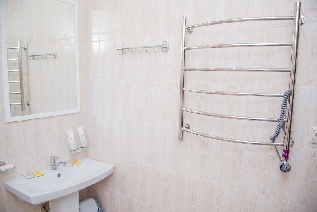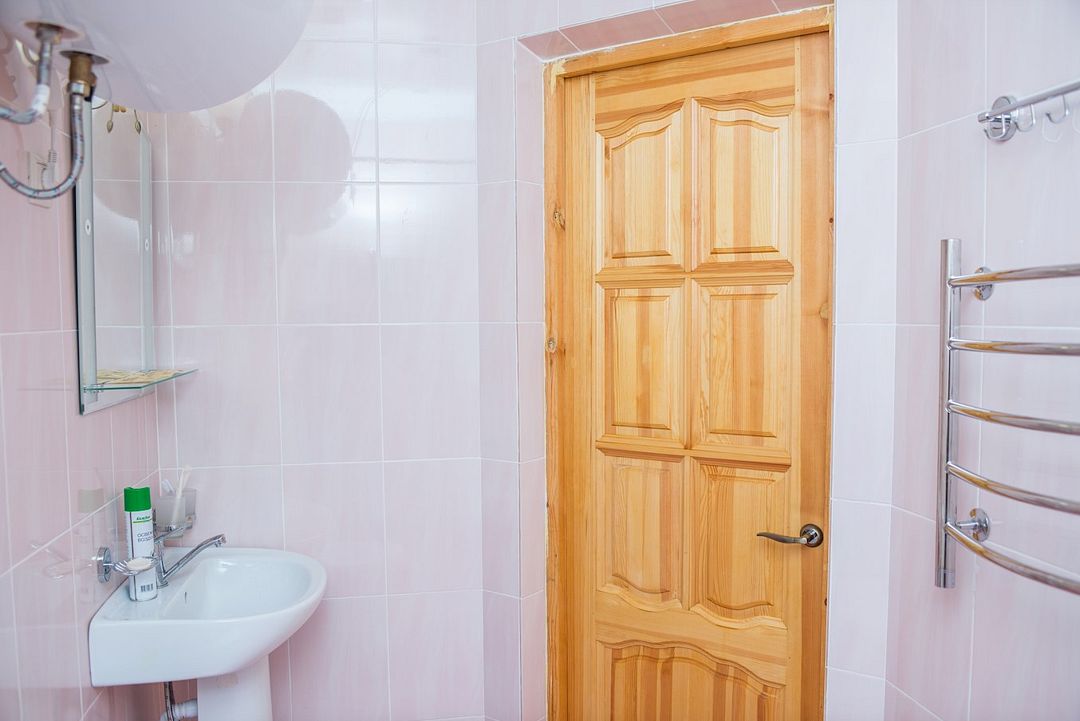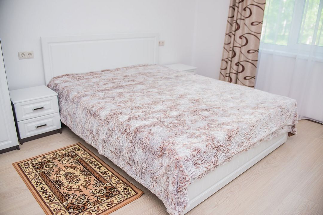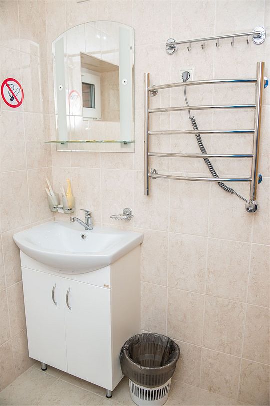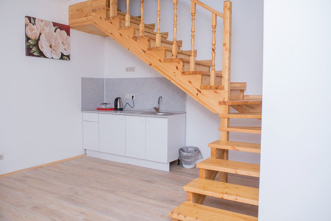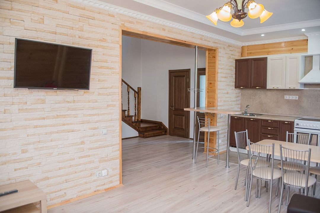 Просторный номер с обеденной зоной (без плиты), спальней и собственным санузлом. В номере две кровати: двуспальная и отдельная детская. Преимущества номера: тёплый пол, кондиционер, горячая вода, wi-fi.