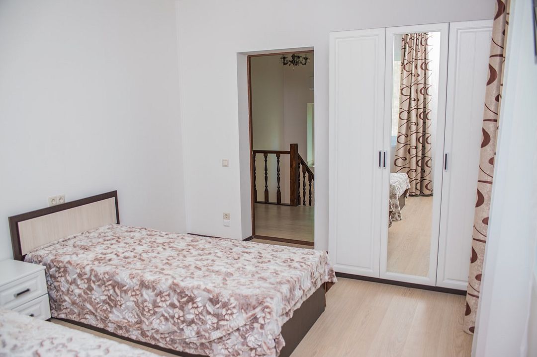 Комфортабельный двухэтажный коттедж. Первый этаж: кухня с плитой, зона отдыха, дополнительная маленькая спальня (комната няни). Второй этаж: рабочий кабинет и 3 спальни. Две отдельных комнаты с двуспальными кроватями и детская комната. В коттедже 2 санузла.