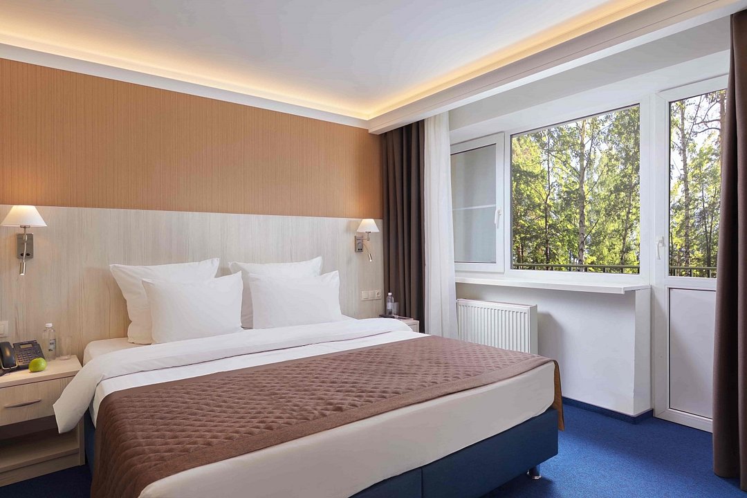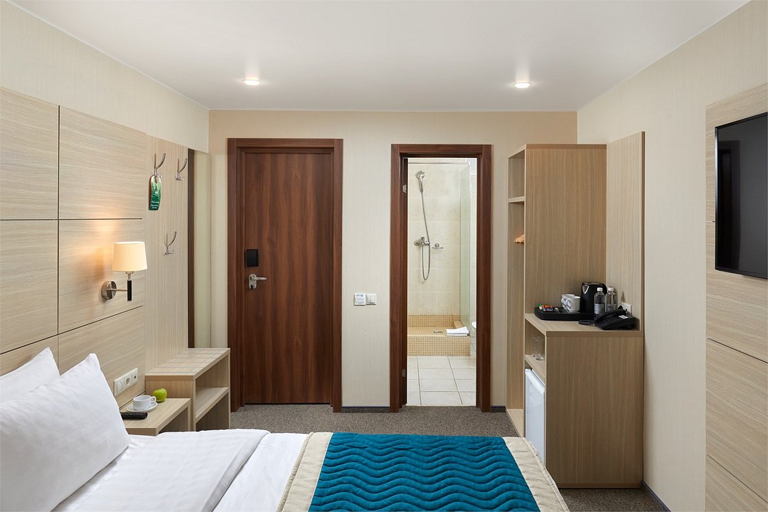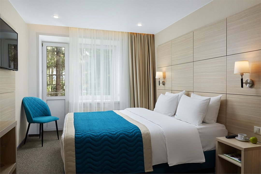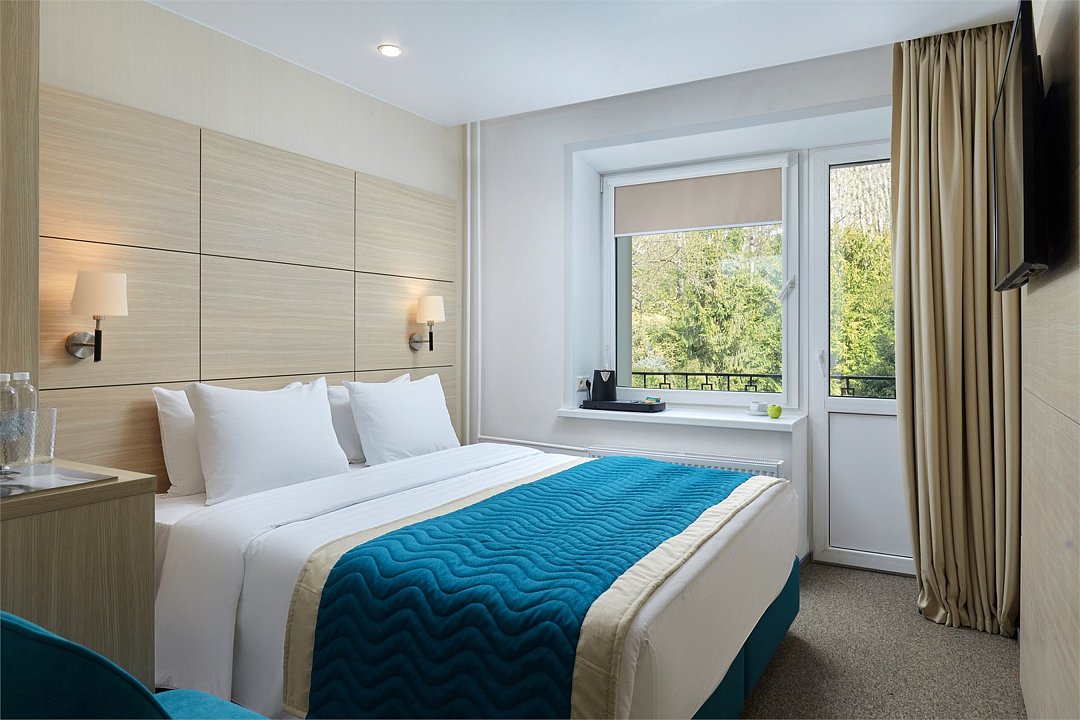 Номер площадью 10 кв.м., двуспальная кровать. Дополнительное место не устанавливается. В номере телевизор, минибар. В ванной комнате туалетные принадлежности, полотенца, фен. Халаты и тапочки в номерах предоставляются для гостей от 12 лет. Возможно размещение двух взрослых на основных местах. Номера расположены в 4 корпусе, номера с балконом.Услуги и удобства