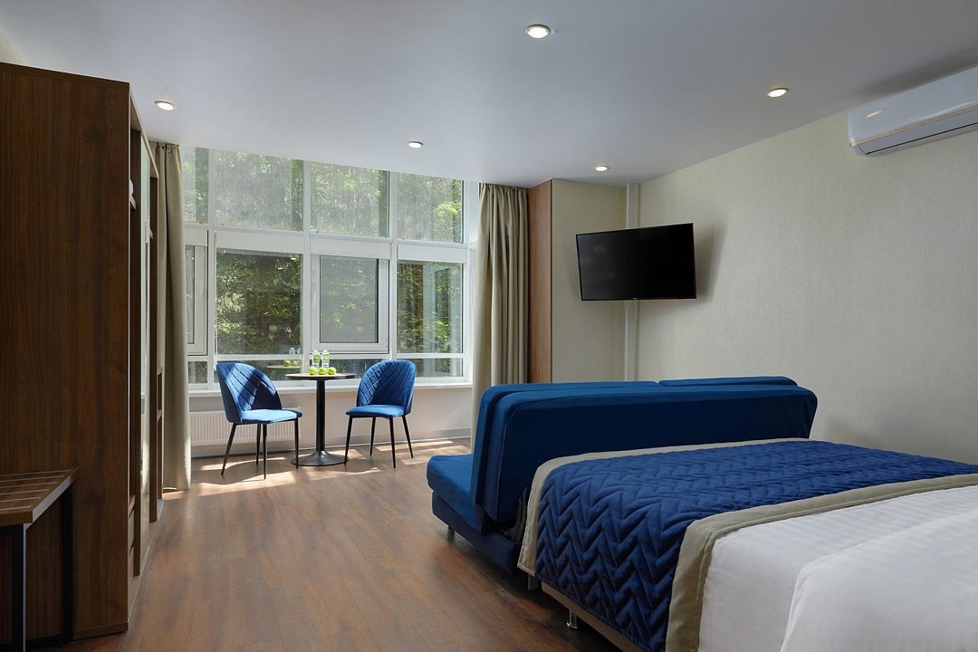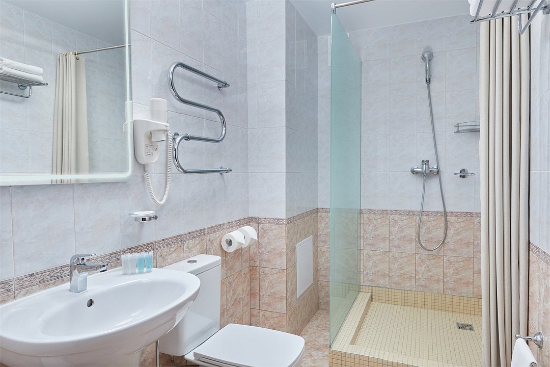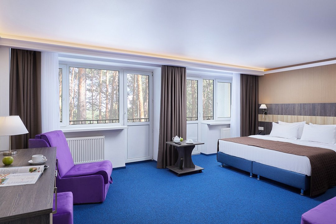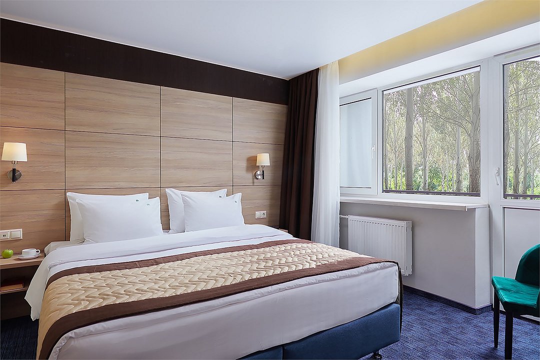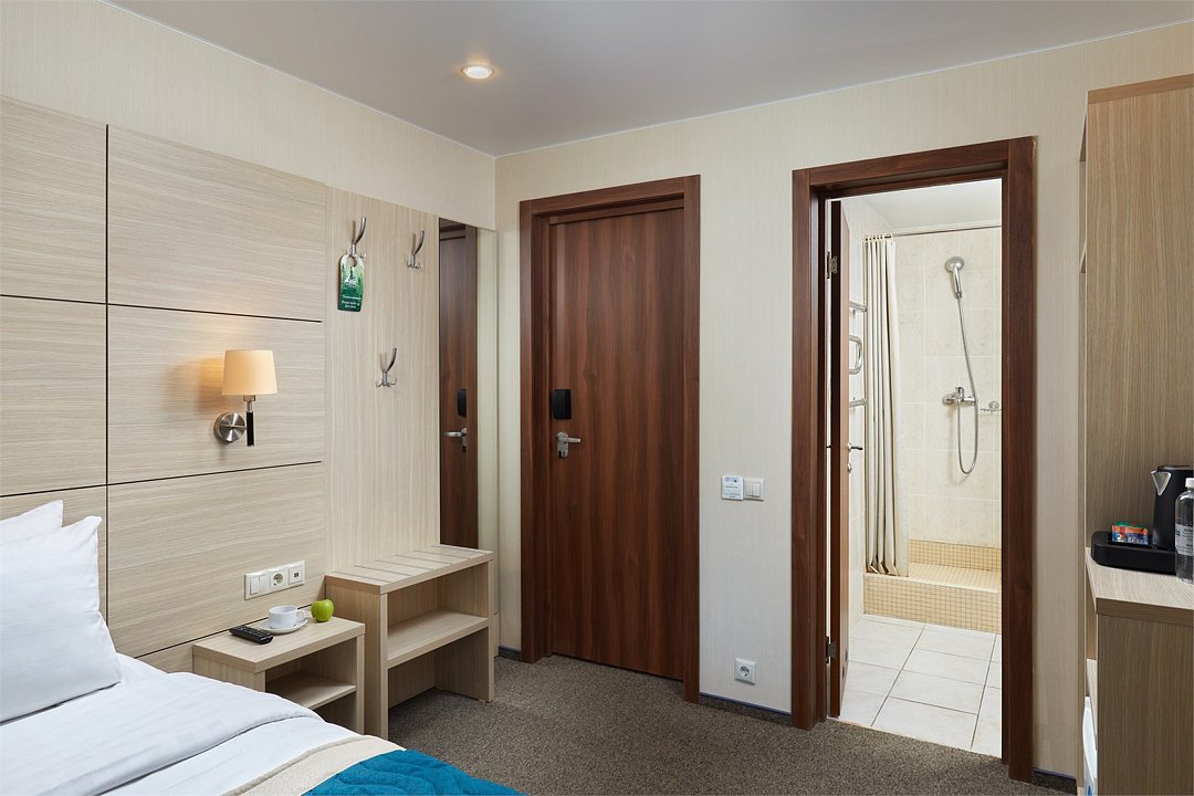 Номер площадью 10 кв.м., двуспальная кровать. Дополнительное место не устанавливается. В номере телевизор, минибар. В ванной комнате туалетные принадлежности, полотенца, фен. Халаты и тапочки в номерах предоставляются для гостей от 12 лет. Возможно размещение двух взрослых на основных местах. Номера расположены в 4 корпусе, номера с балконом.Услуги и удобства