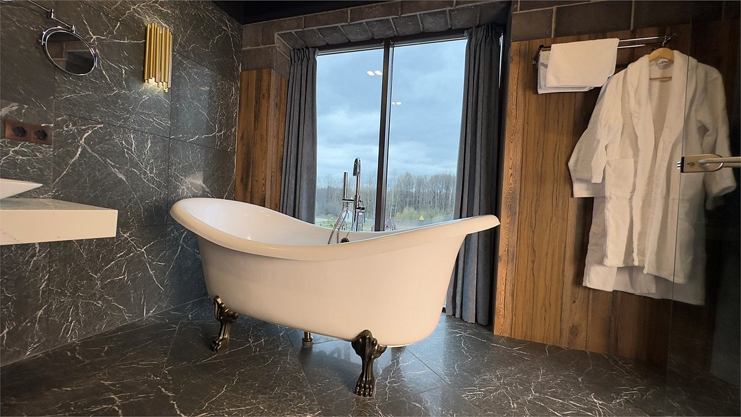 Роскошный «Белый» люкс предлагает исключительный комфорт для каждого гостя. Номер оснащен просторной спальней и зоной отдыха. Главная особенность номера — большая ванна.