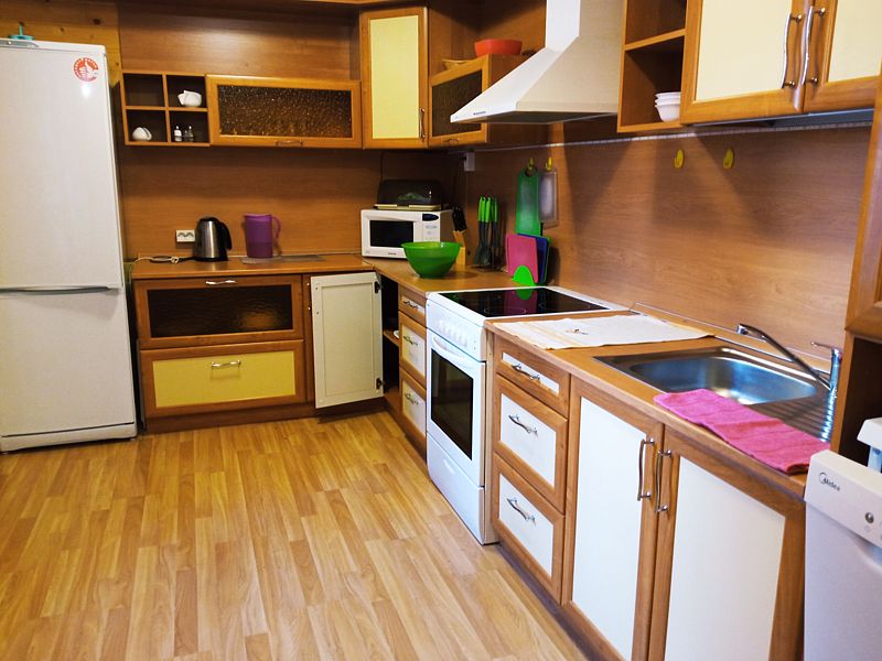Кухня со всем необходимым для приготовления блюд (посуда, микроволновая печь, посудомоечная машина, эл. плита)