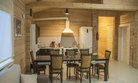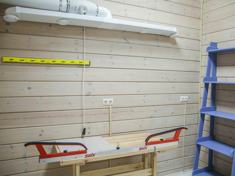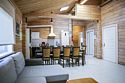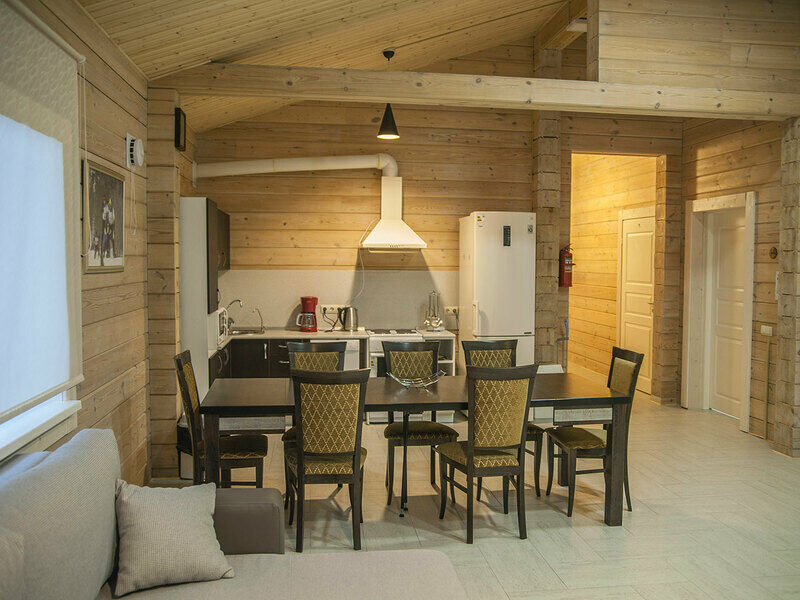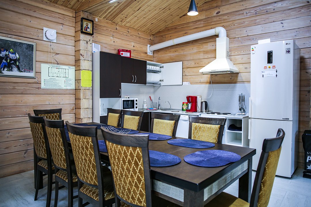 Дом оснащен уютной гостиной комнатой с диваном, большим обеденным столом, телевизором, кухонным уголком, оборудованным бытовой техникой (плитой, холодильником, посудомоечной машиной, микроволновой печью, чайником, кофеваркой, кухонными принадлежности, посудой), тремя совмещенными с душевой комнатой санузлами, стиральной машиной, теплыми полами, сервисной комнатой для хранения и подготовки спортивного инвентаря, доступом в интернет (Wi-Fi бесплатно).