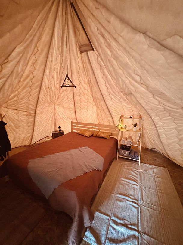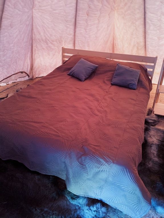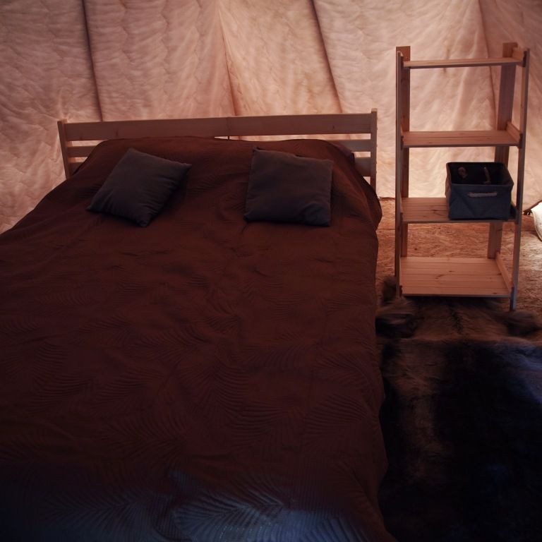 В чуме есть все необходимое: двуспальная кровать с ортопедическим матрасом, теплые пуховые одеяла, хлопковое постельное белье, стеллаж для вещей, печь-камин + дрова и все необходимое для розжига.